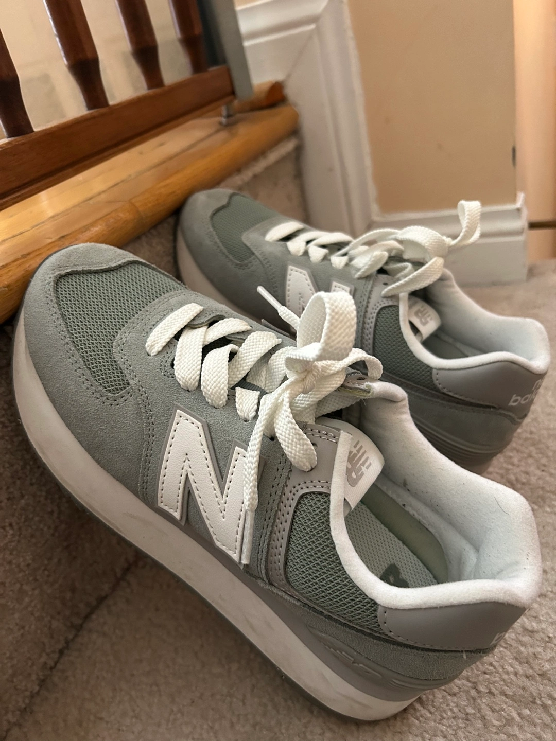 Grey suede New Balance 574 sneakers. Classic style, comfortable fit. Great for everyday wear.