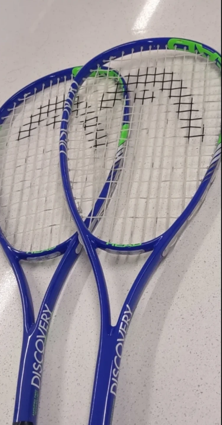 Two blue Discovery racquets are available. They're great for beginner players. The frames are blue with green accents on the head.
