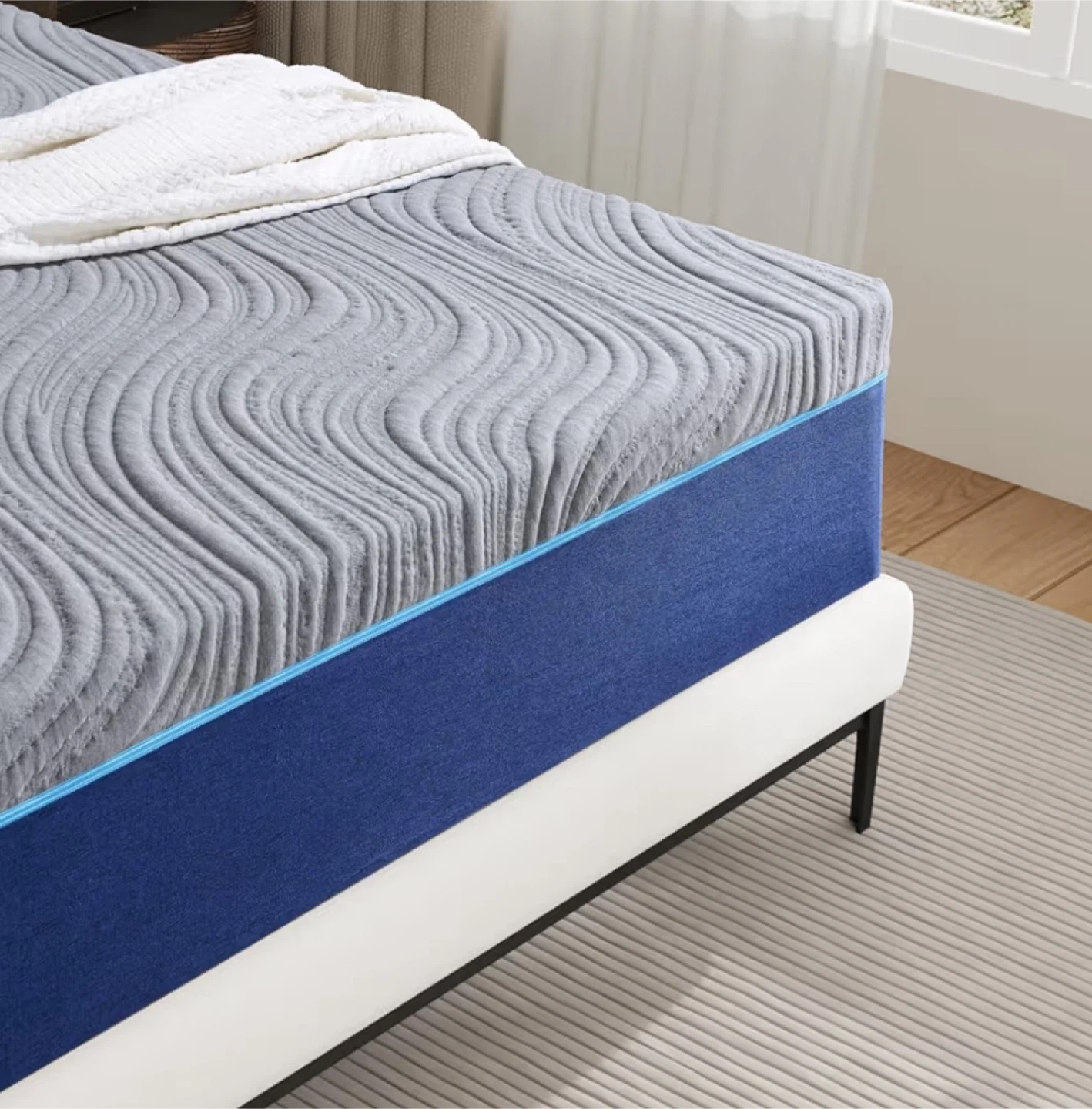 This is a grey and blue hybrid mattress. It has a wave-patterned grey top. The sides are a solid blue fabric. Provides great comfort for a good night's sleep.