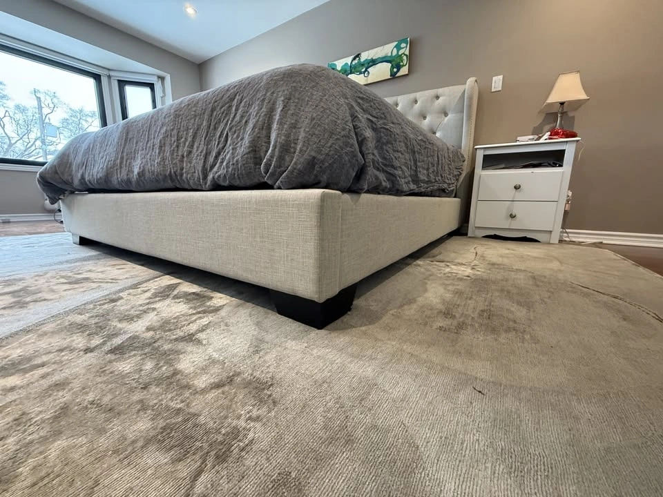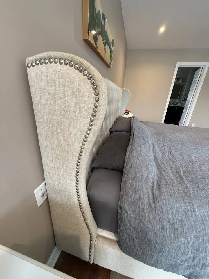 Beautiful king size upholstered bed in a neutral linen-look fabric that works with almost any décor. The bed has a wingback headboard with button tufting and nailhead trim. Solid, sturdy, and VERY comfortable.