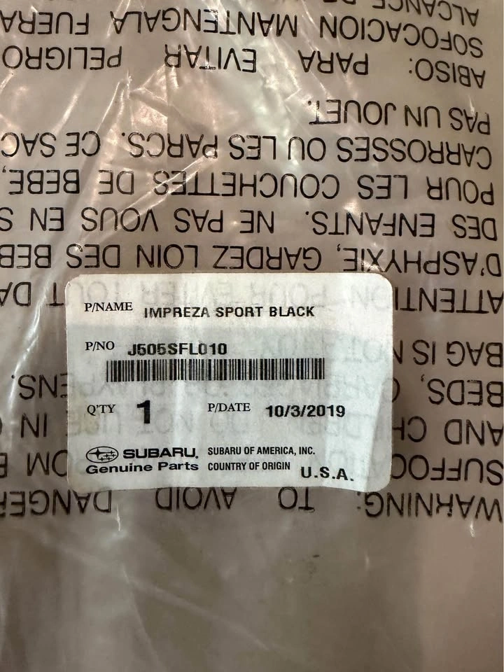 Genuine Subaru factory floor mats, never used. Removed from original packaging for photos only. Fits 2017–2021 Subaru Impreza Sport 4-door. May also fit certain Crosstrek models — please verify using part number J505SFL010 before purchasing.