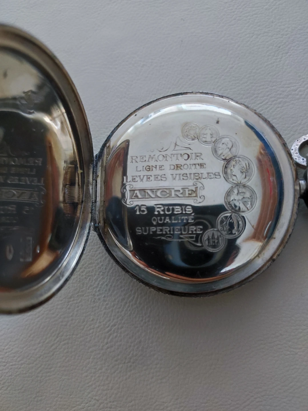 Selling a beautiful vintage Lanco pocket watch! It features a unique design with intricate detailing. Inside the back cover, it says 'REMONTOIR LIGNE DROITE LEVEES VISIBLES ANCRE 15 RUBIS QUALITE SUPERIEURE'. A great piece for collectors or anyone who appreciates classic timepieces