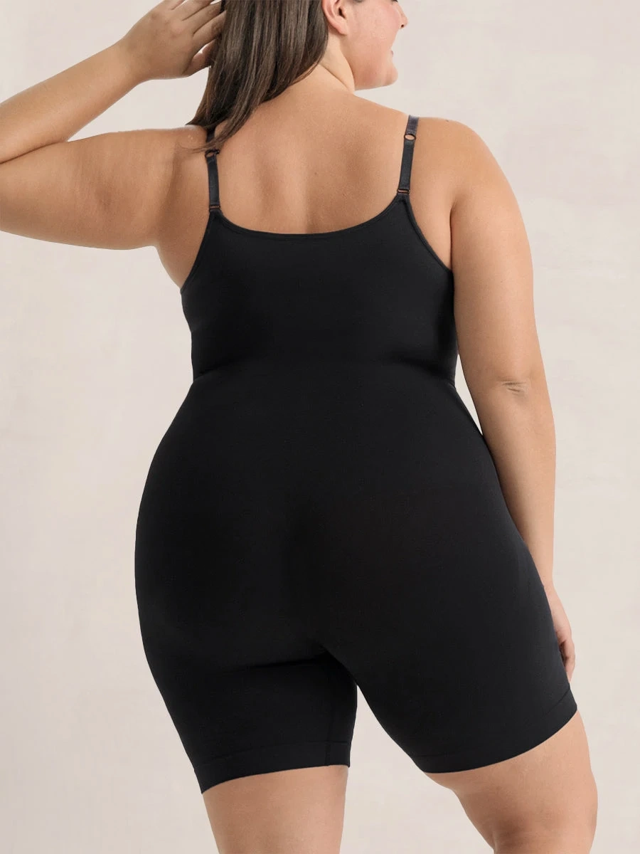 Comfortable black bodysuit shapewear with adjustable straps. It provides light shaping and is made from a stretchy nylon and spandex blend. Smooth and seamless design for a comfortable fit under clothing.