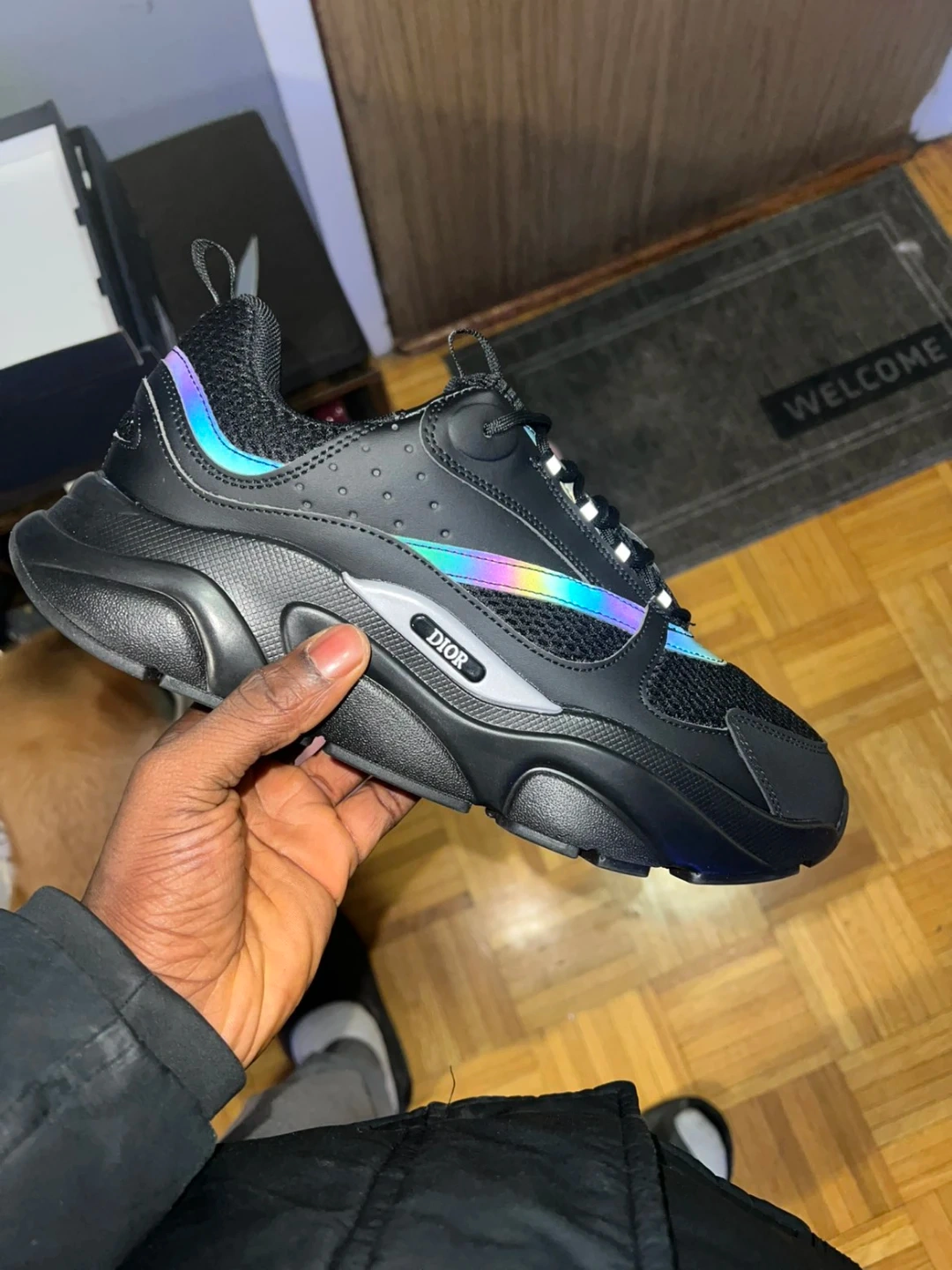 These are Dior B22 sneakers in black calf mesh. Made in Italy. Includes original box and dust bag.