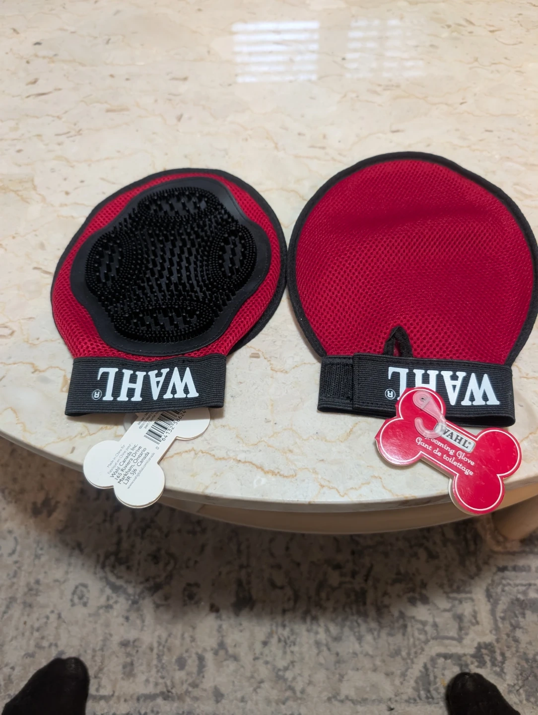 These Wahl grooming gloves are designed for effective pet grooming. They feature a red mesh material with black rubber bristles on one side to help remove loose fur and massage your pet's coat. The gloves are sold as a pair. Great for regular grooming sessions!