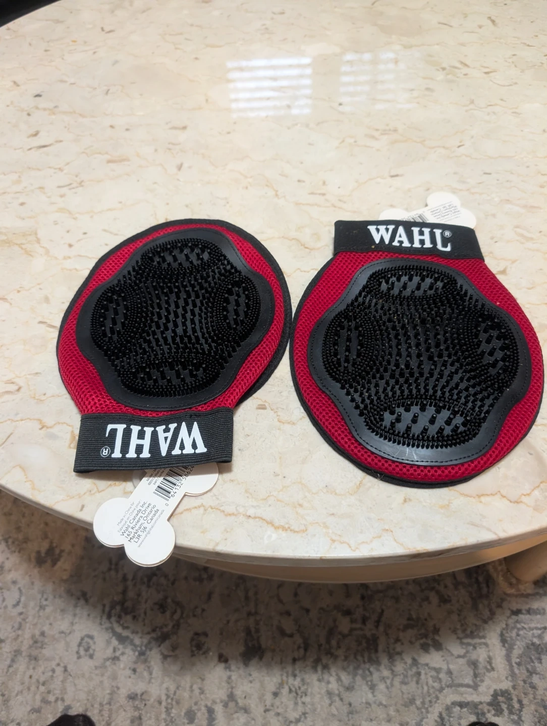 These Wahl grooming gloves are designed for effective pet grooming. They feature a red mesh material with black rubber bristles on one side to help remove loose fur and massage your pet's coat. The gloves are sold as a pair. Great for regular grooming sessions!