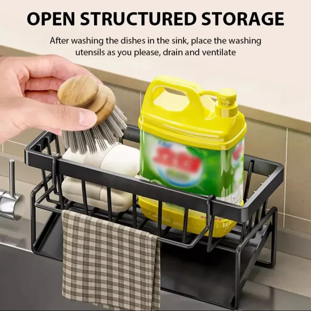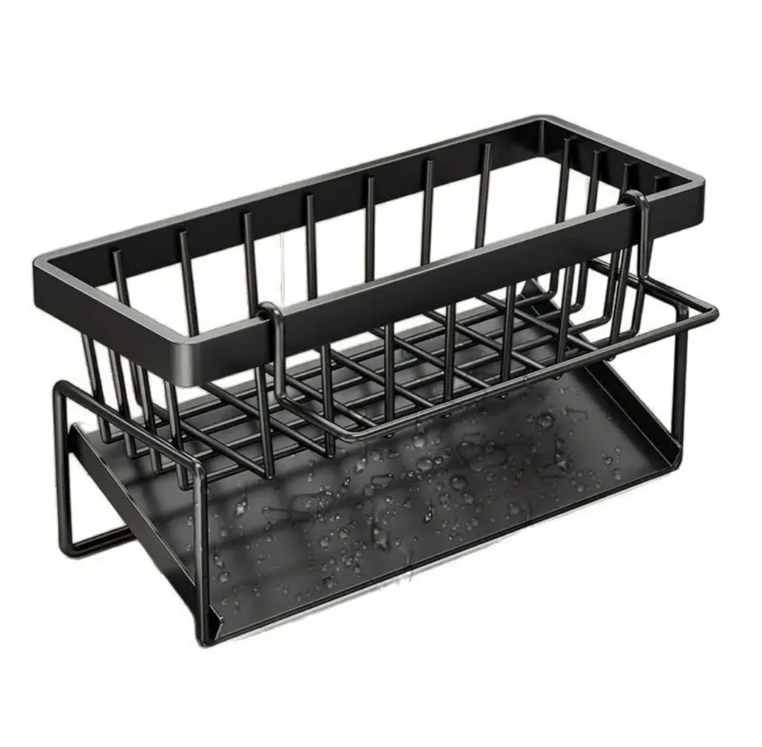 This kitchen sink caddy is designed for organizing dish soap, sponges, and brushes. It's made from thickened ABS material that's scratch, wear, and rust resistant. The open structure allows for drainage and ventilation.