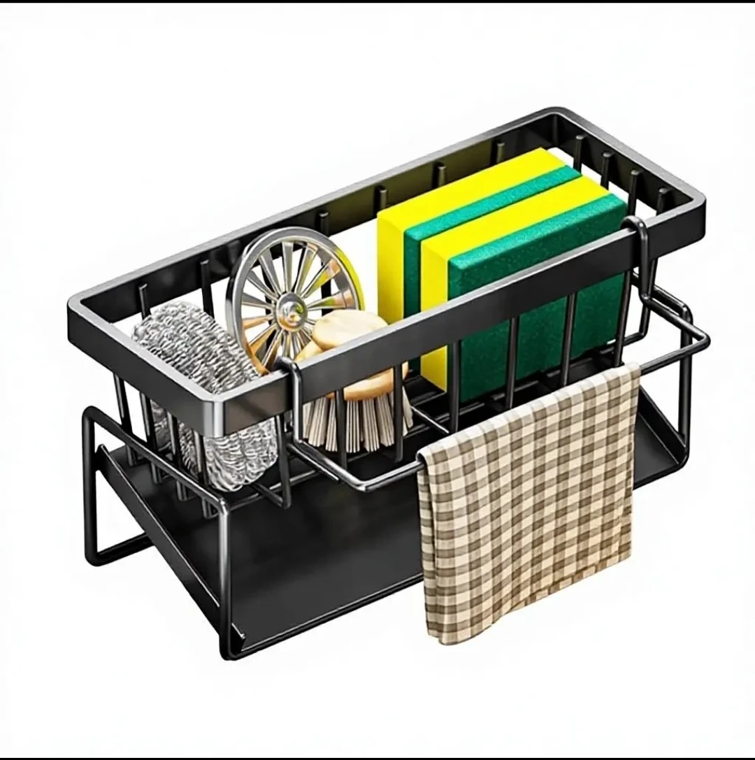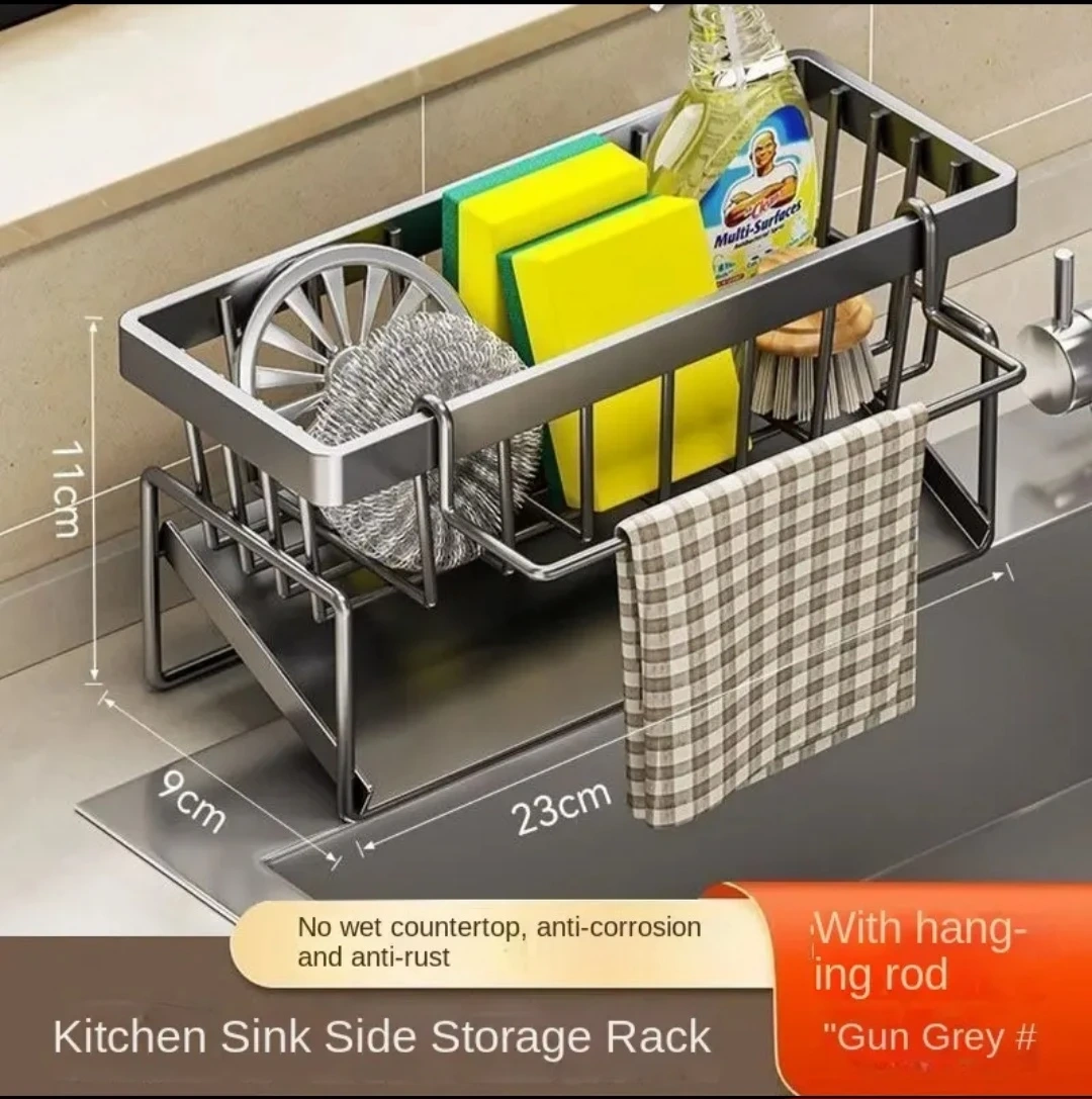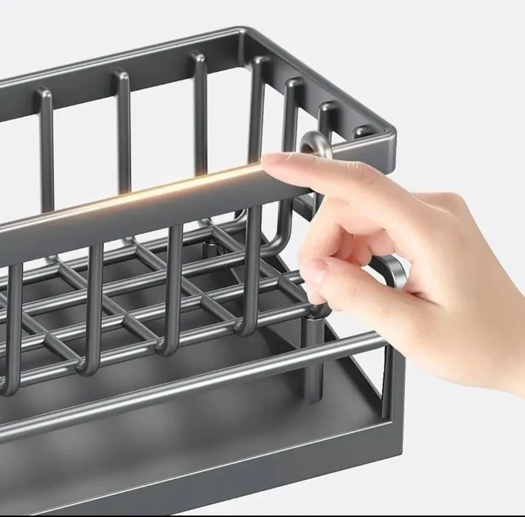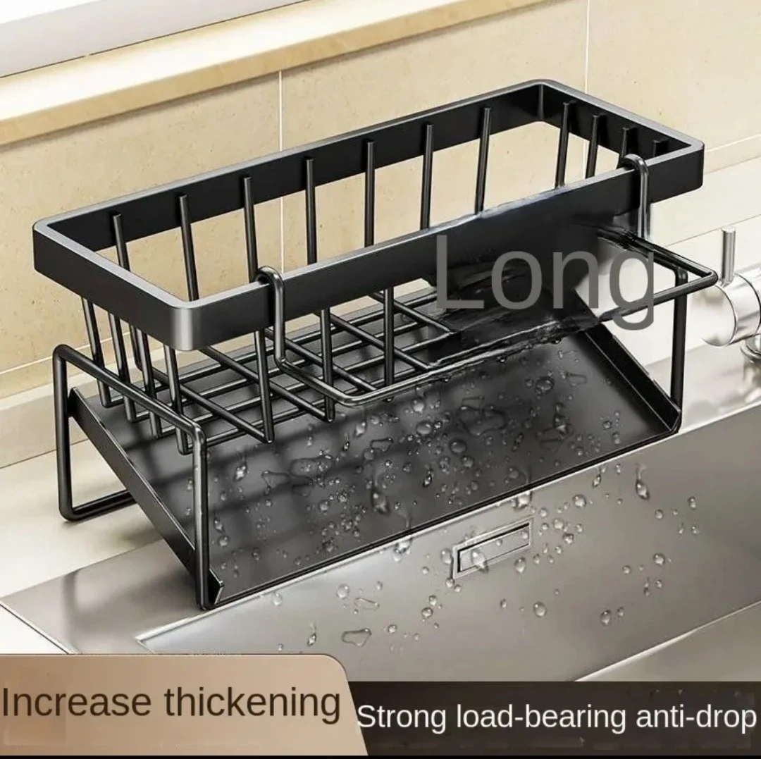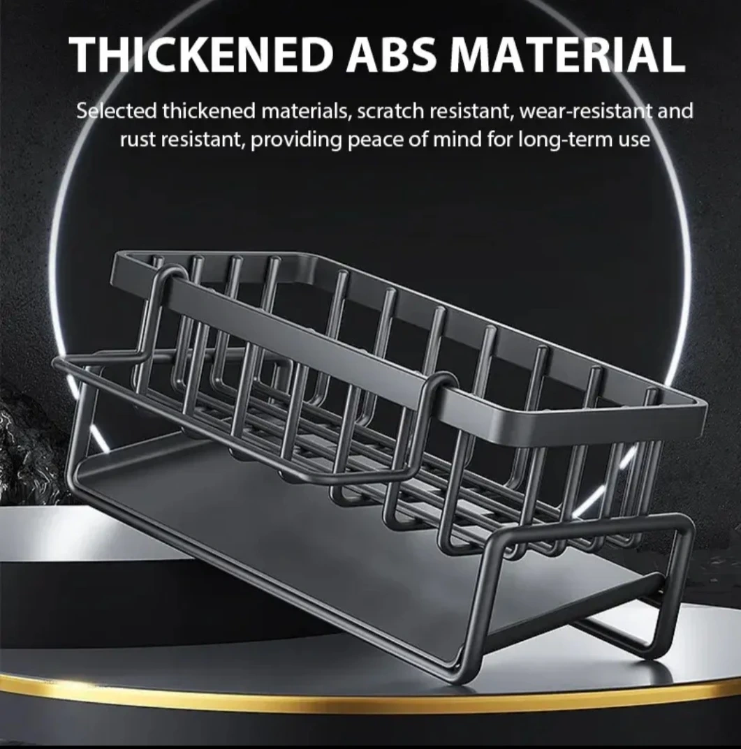 This kitchen sink caddy is designed for organizing dish soap, sponges, and brushes. It's made from thickened ABS material that's scratch, wear, and rust resistant. The open structure allows for drainage and ventilation.