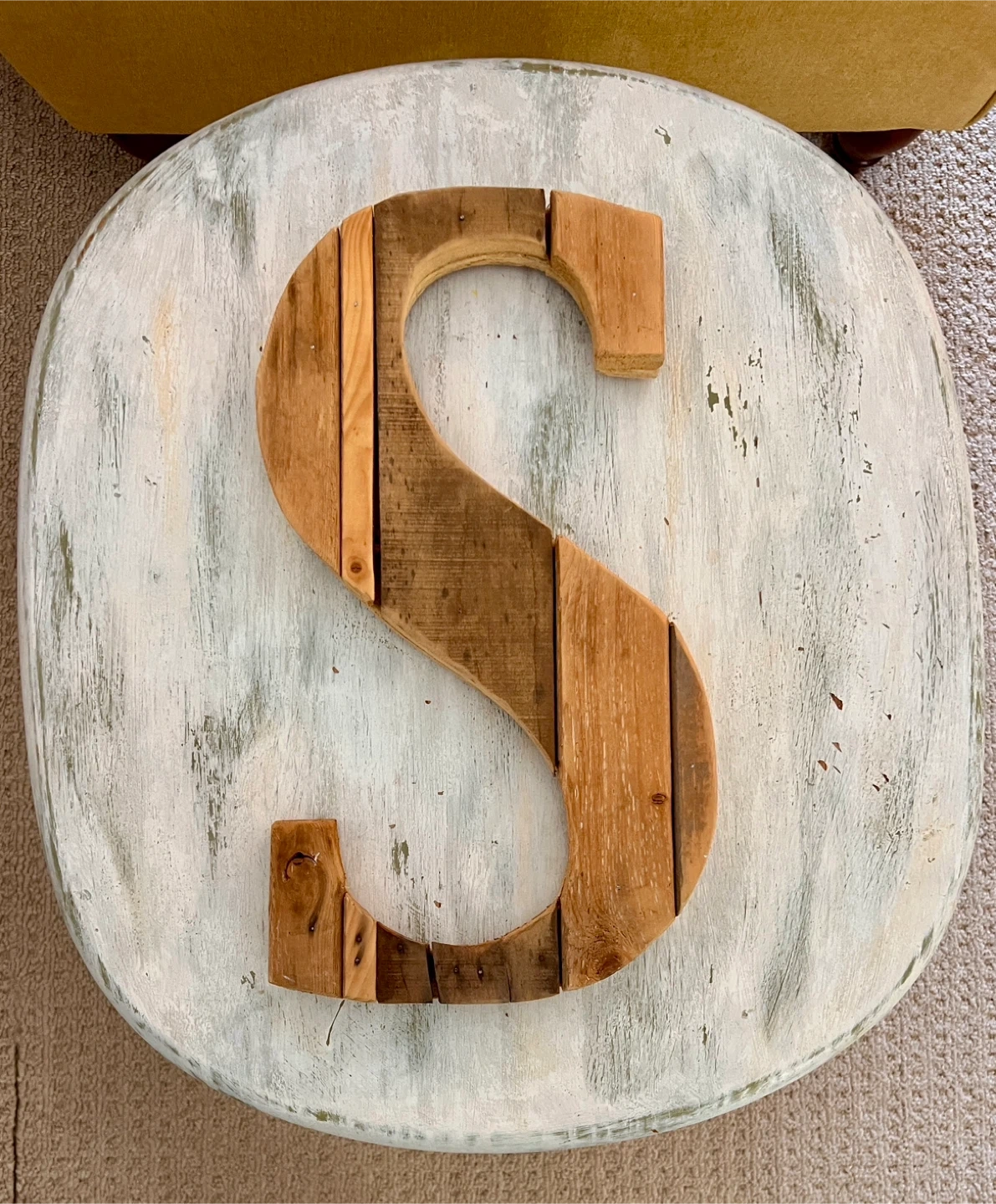Rustic wooden letter “S” sign made from reclaimed wood. A nice decorative piece for a shelf, wall, or entryway.