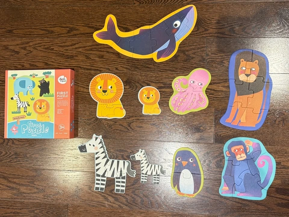 Three boxes of kids puzzles. One box (the yellow box with Lion) contains more but different items. This is reflected in the pricing. The puzzles are in great condition!