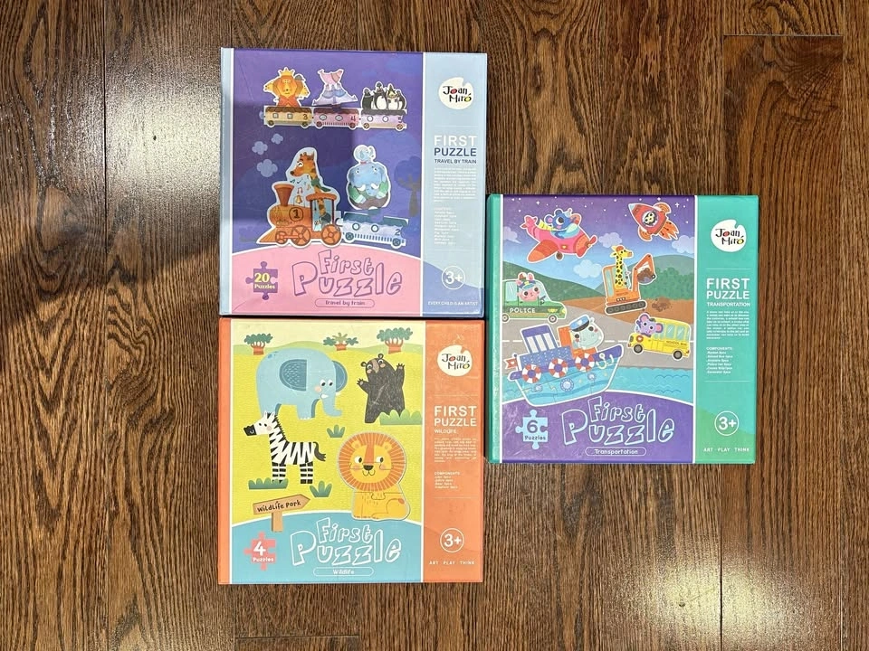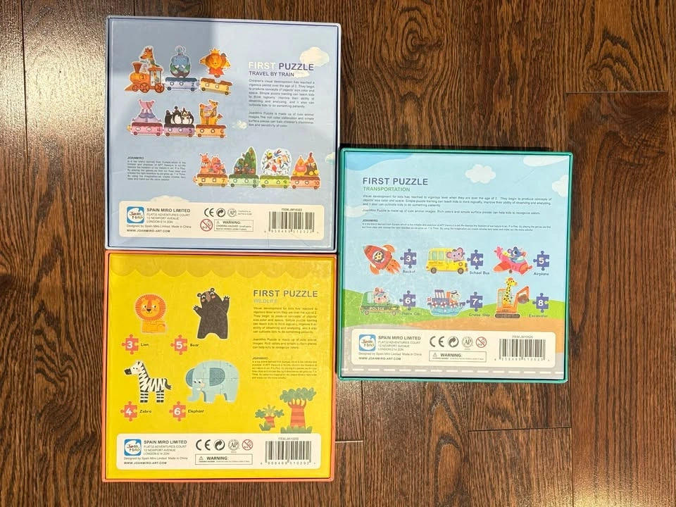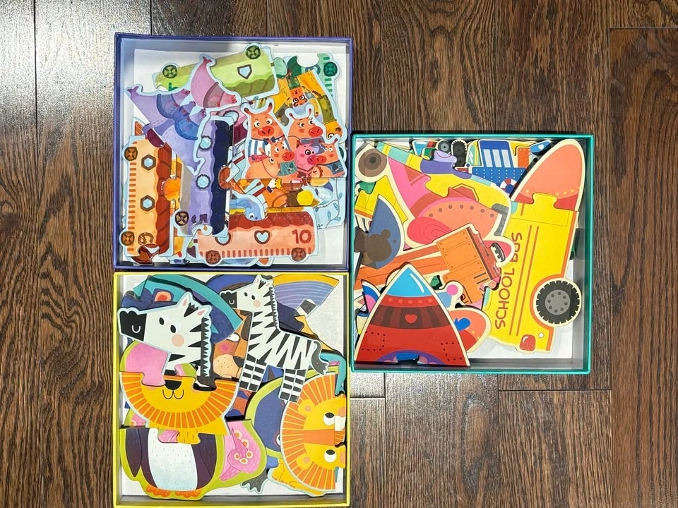 Three boxes of kids puzzles. One box (the yellow box with Lion) contains more but different items. This is reflected in the pricing. The puzzles are in great condition!