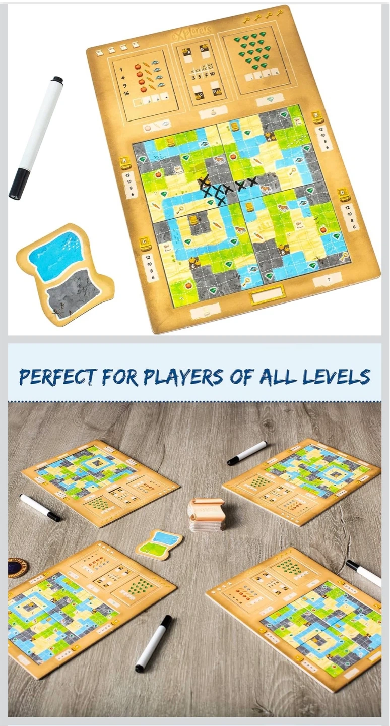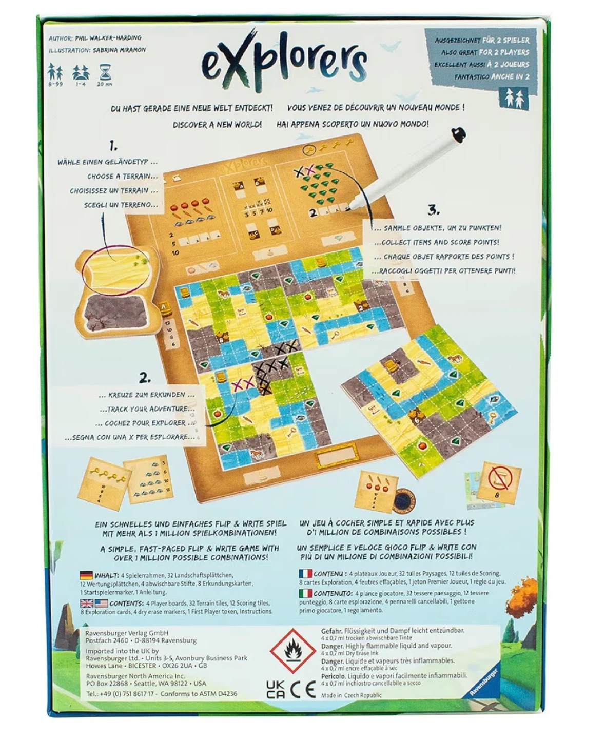 This Ravensburger Explorers board game is designed for 1-4 players and takes about 20 minutes to play. It's a simple, fast-paced flip & write game with over 1 million combination possibilities. Includes 4 player boards, 32 terrain tiles, 12 scoring tiles, and 4 markers.