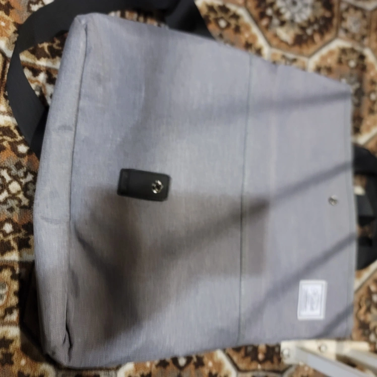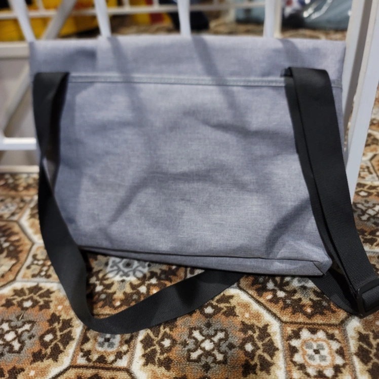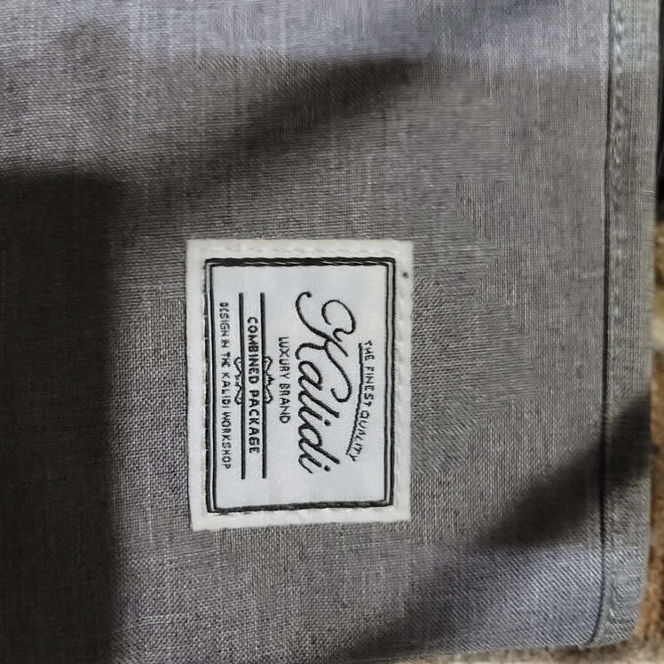 Grey fabric messenger bag. Adjustable shoulder strap. Small front pocket. Features a Khaidi brand label.