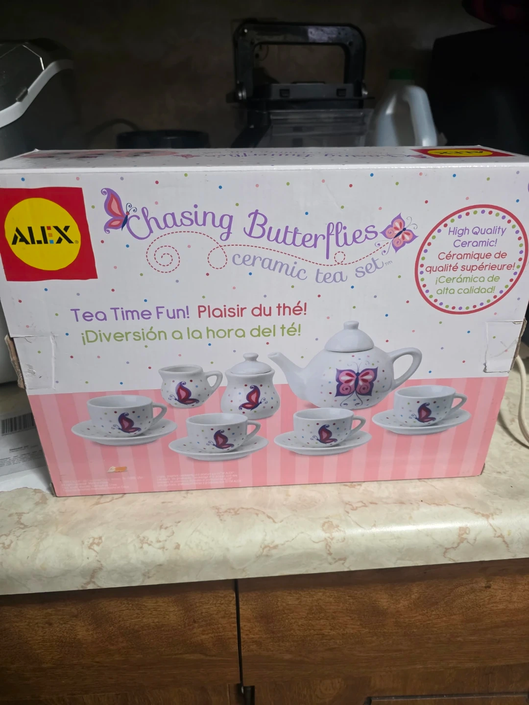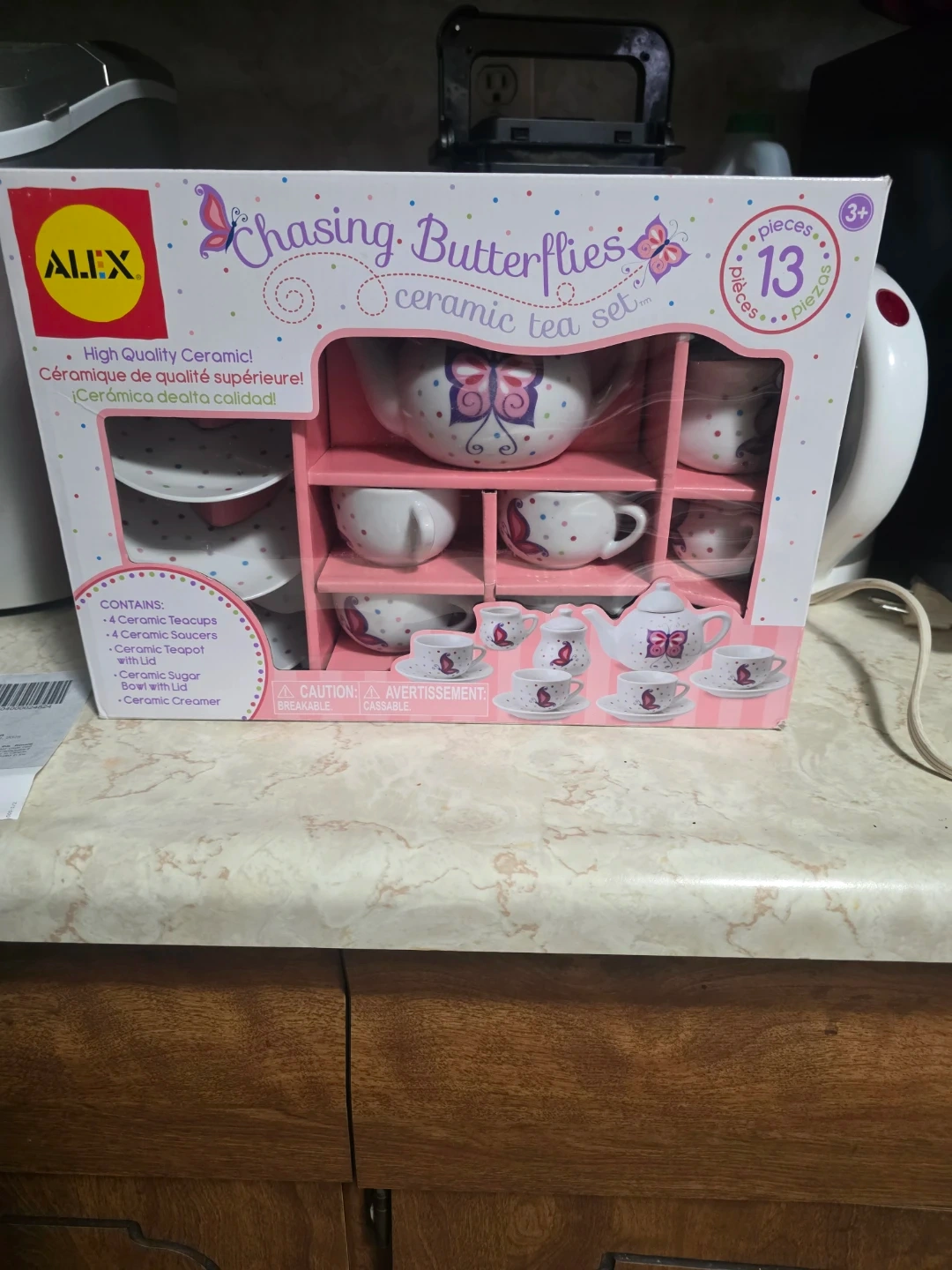 This is a 13-piece ceramic tea set for kids, featuring a "Chasing Butterflies" design. It includes a teapot, sugar pot, creamer, four teacups, and four saucers. Made from high-quality ceramic, it's perfect for imaginative play.
