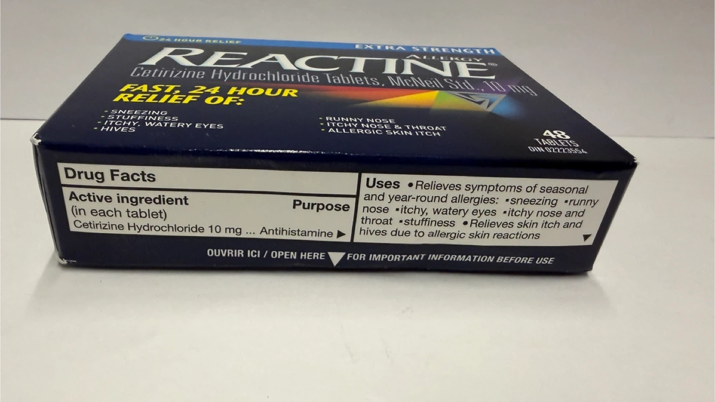 Fast, 24-hour relief for allergy symptoms like sneezing, stuffiness, and itchy eyes. Cetirizine Hydrochloride tablets, McNeil Std., 10 mg. Contains 48 tablets.