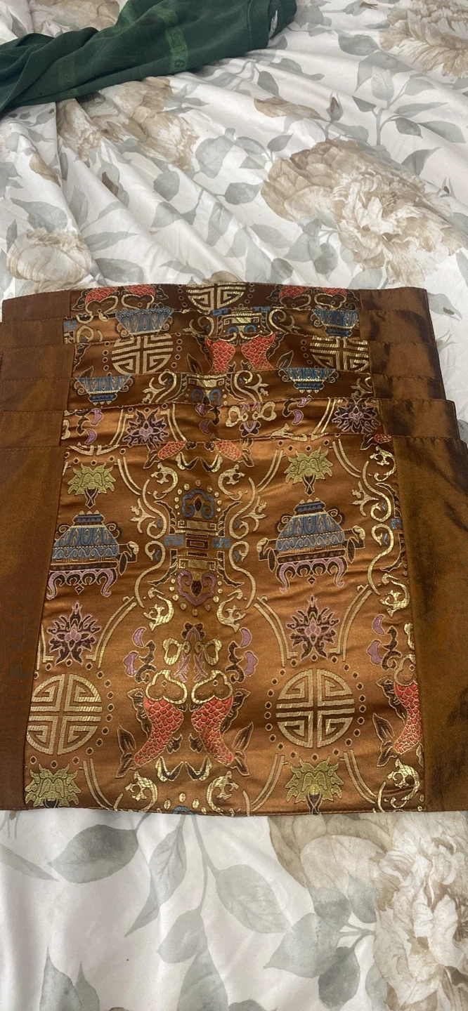 A set of six PLACEMATS featuring a beautiful ornate pattern in gold and brown tones. It also includes a set of six pairs of CHOPSTICKS with decorative holders. These would add elegance to any dining table! (NEW & UNUSED)