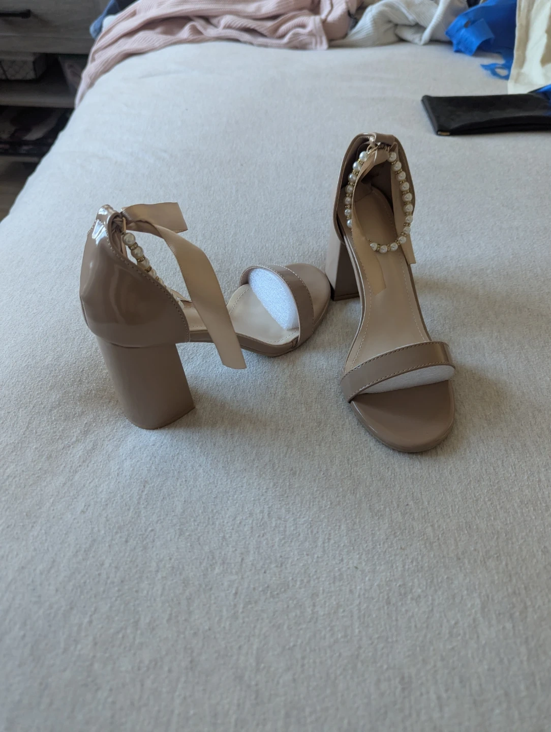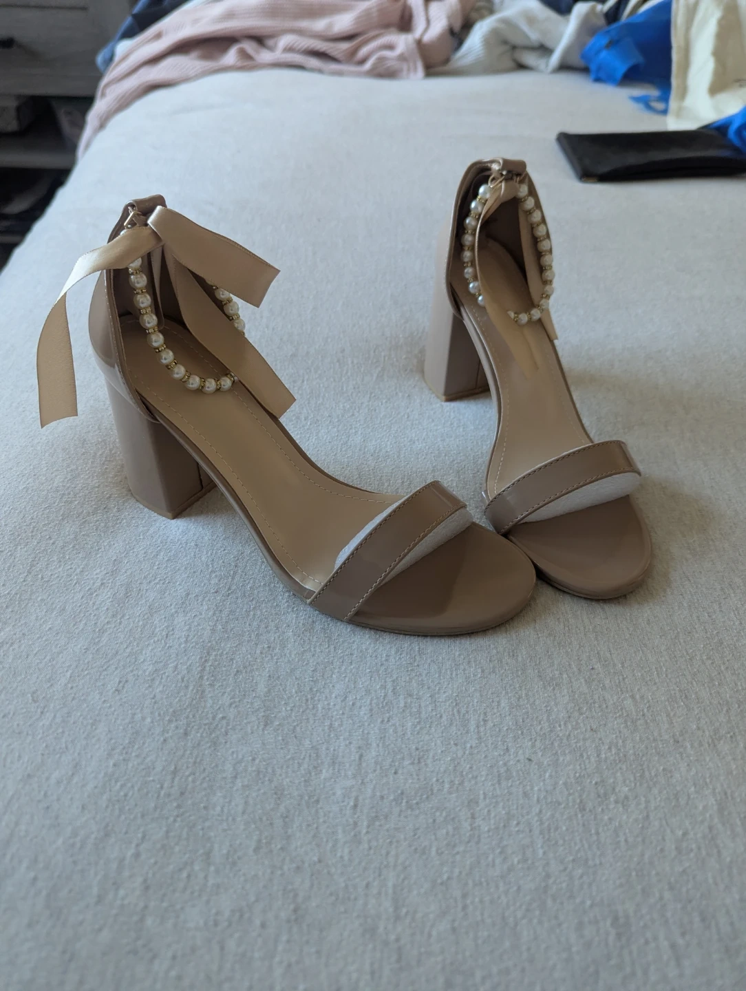 These stylish beige block heel sandals feature a delicate pearl ankle strap and a cute bow detail. They're perfect for dressing up or down for any occasion. The sturdy block heel provides comfort and stability.