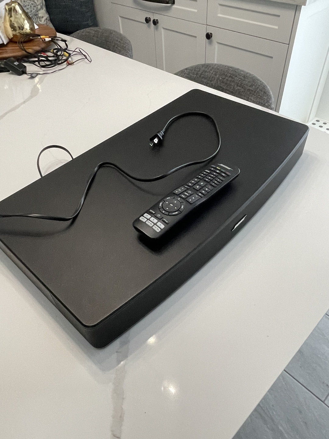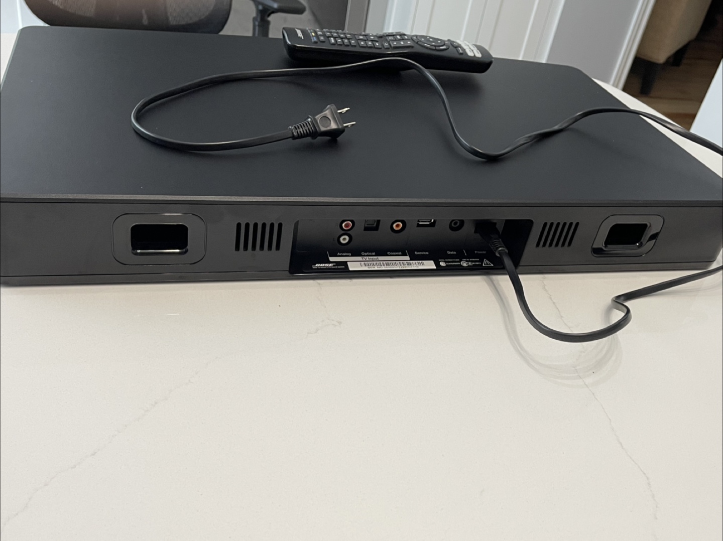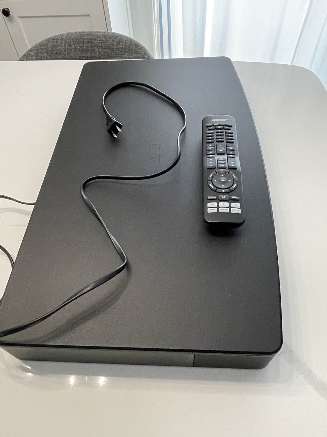 Selling a Bose Solo 5 TV soundbar in black. It's a great way to improve your TV's audio quality with clear sound. Comes with a remote control for easy operation and cables.
