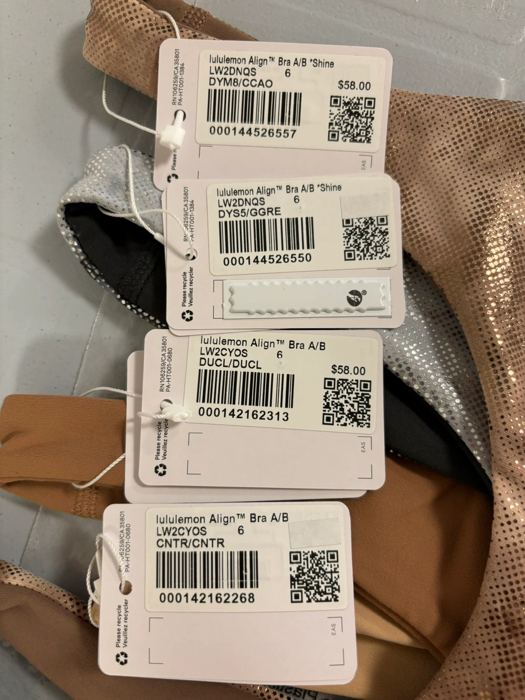 4 Lululemon Align Bras in various colours and sizes. All are size 6 and are in brand new condition with tags attached. The bras are in the colours Cacao, Shine, and 2 different shades of brown. (Haha, seriously, thanks AI)