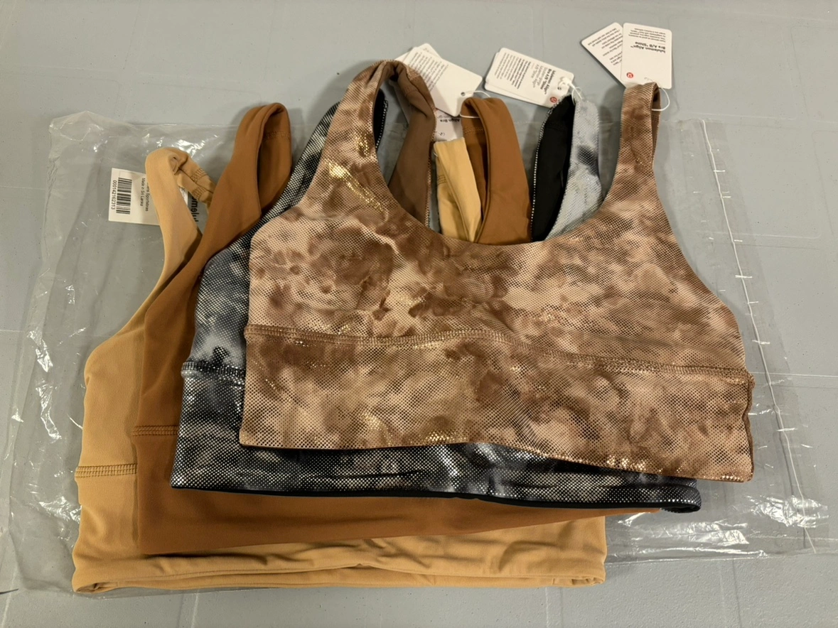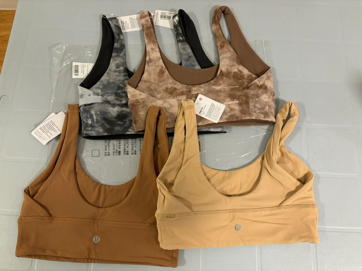4 Lululemon Align Bras in various colours and sizes. All are size 6 and are in brand new condition with tags attached. The bras are in the colours Cacao, Shine, and 2 different shades of brown. (Haha, seriously, thanks AI)
