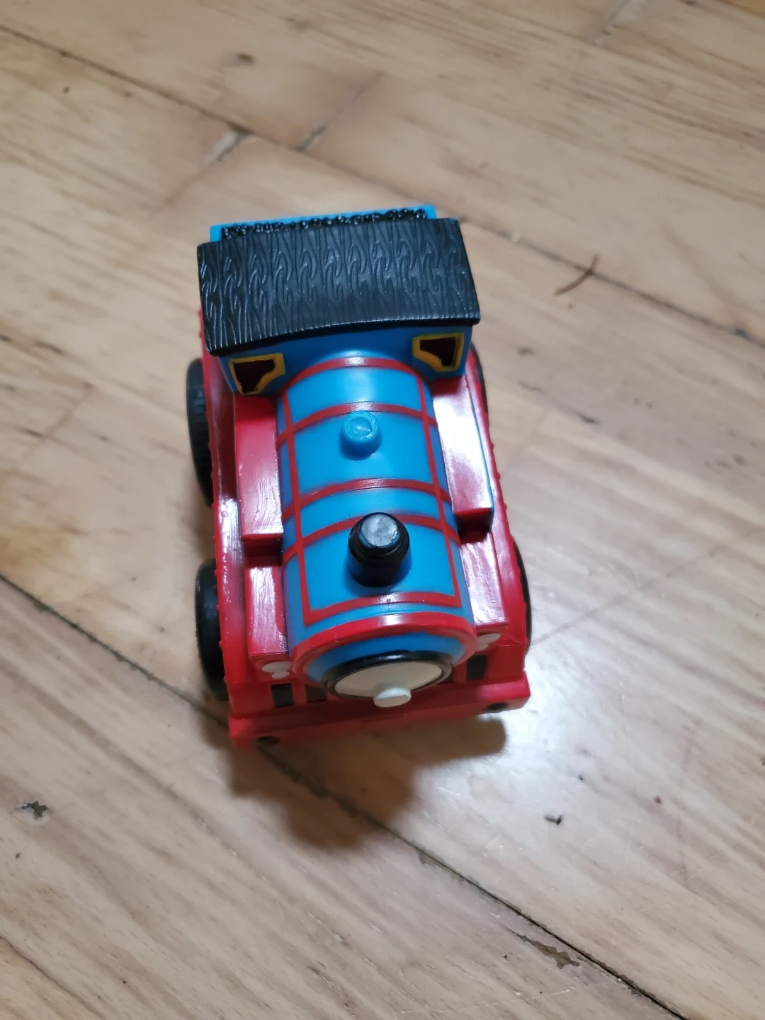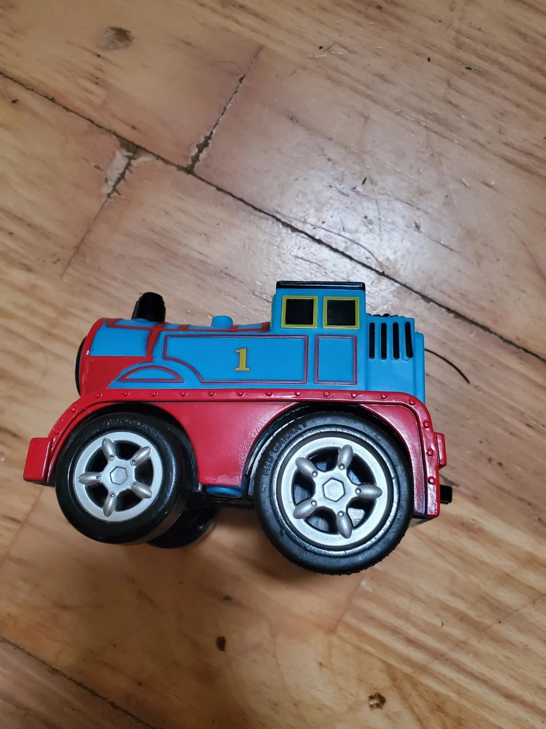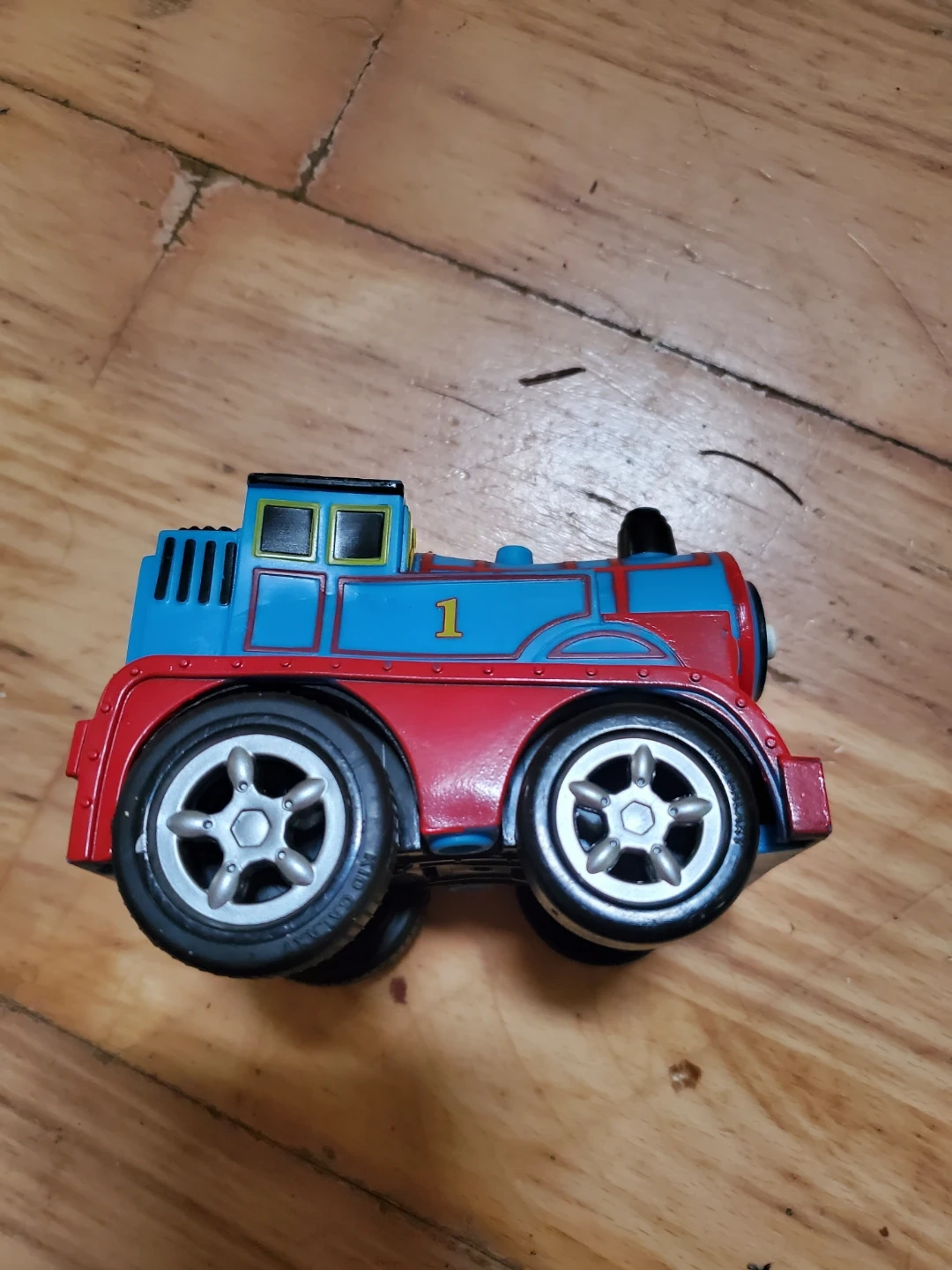A red and blue Thomas the Tank Engine toy train wannabe with the number 1 on its side. It's made of plastic with black wheels. This toy is great for little engineers who love trains!
