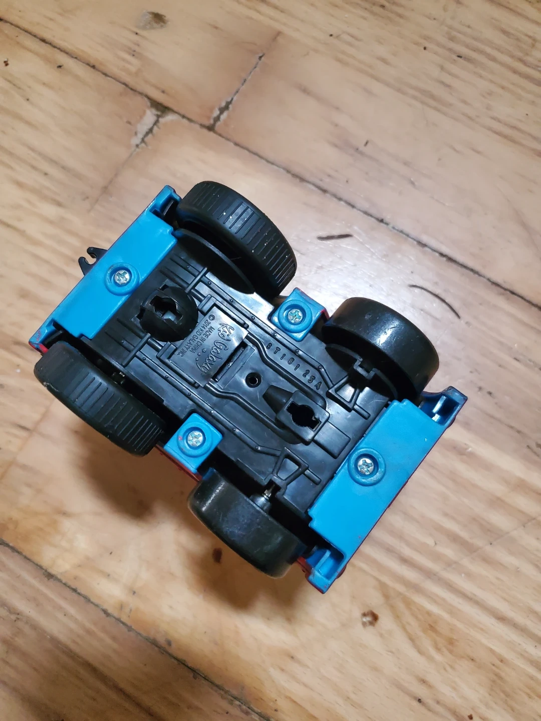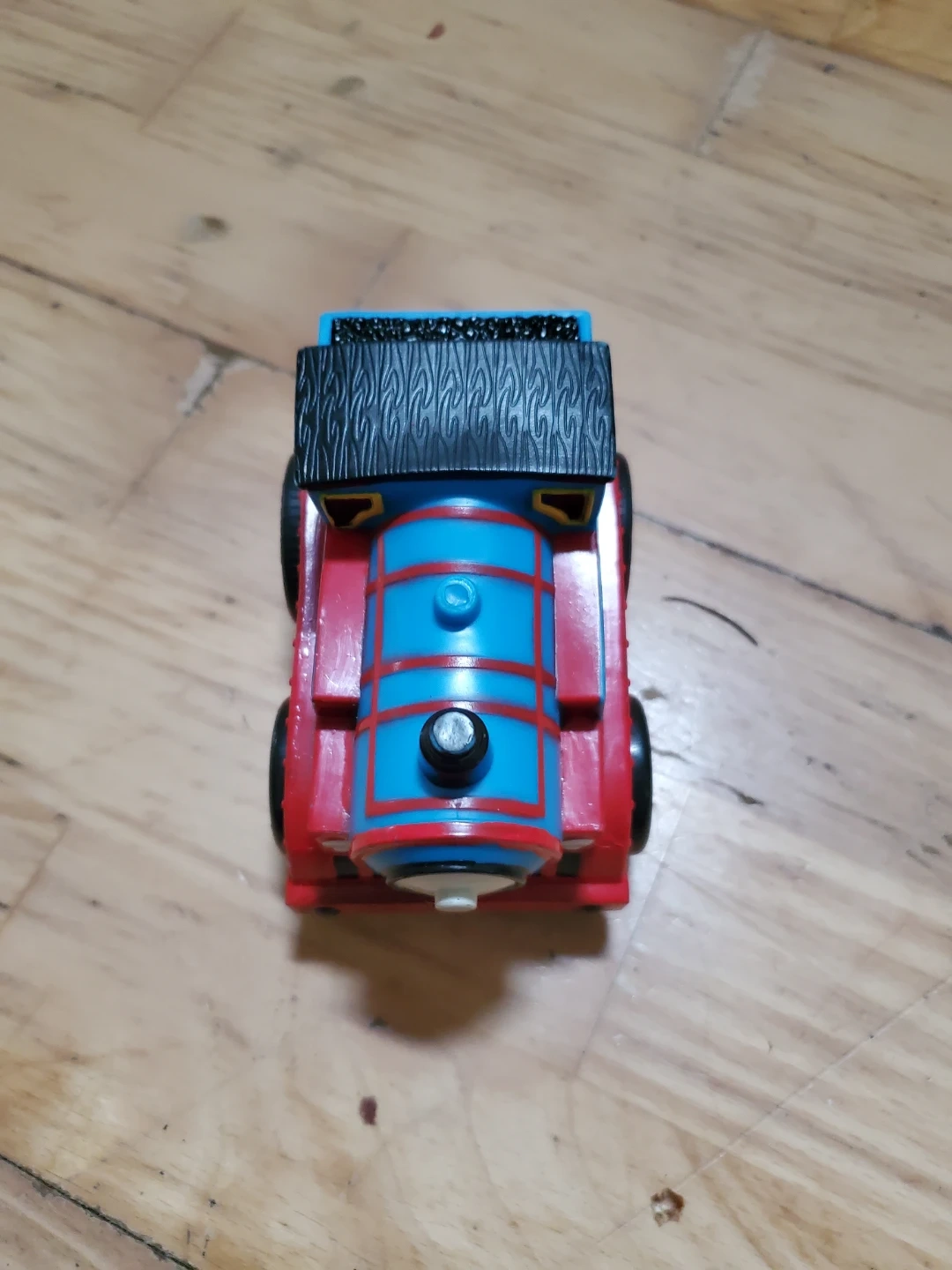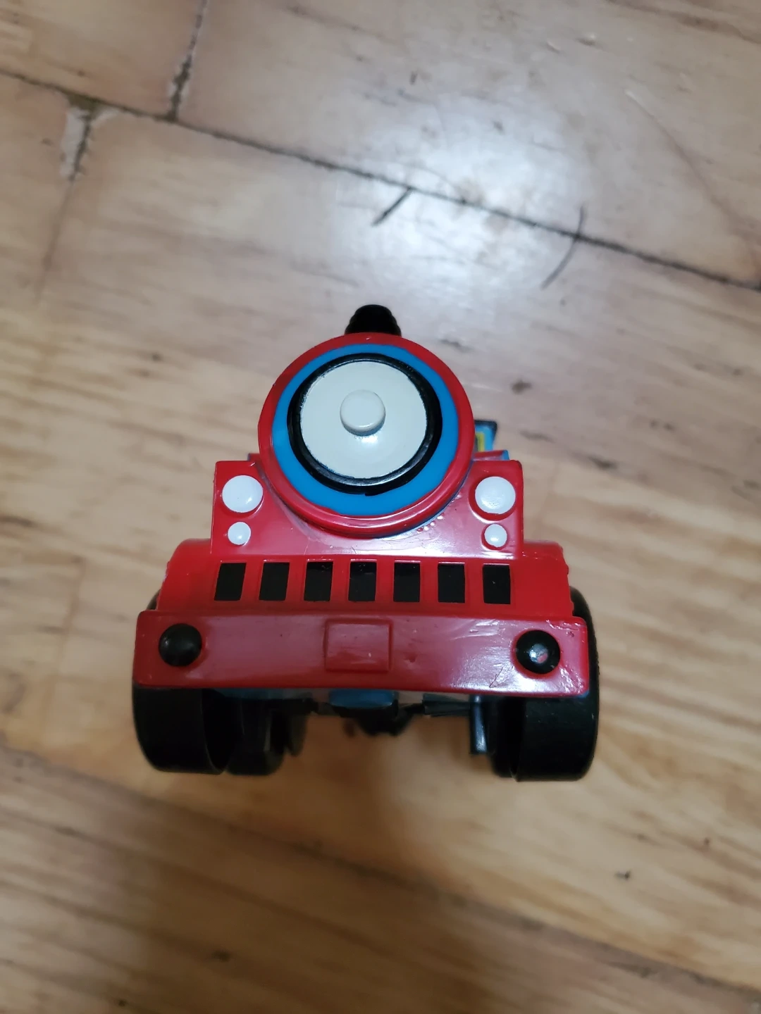 A red and blue Thomas the Tank Engine toy train wannabe with the number 1 on its side. It's made of plastic with black wheels. This toy is great for little engineers who love trains!