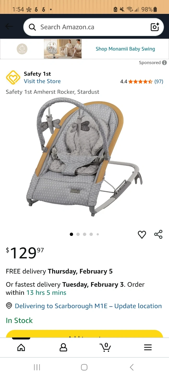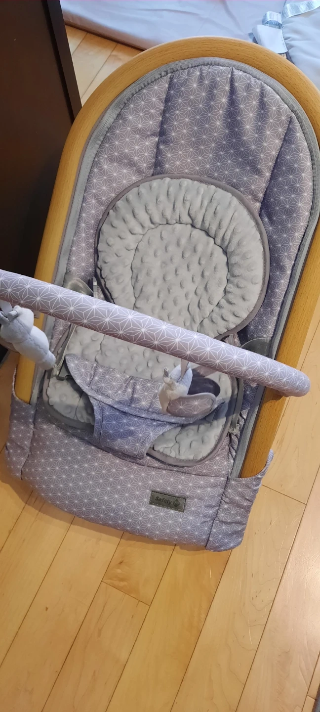 Barely used Safety 1st Amherst Rocker in the Stardust pattern. It has a plush fabric seat with a gentle rocking motion. It's designed for baby's comfort and can be used from birth. Manufactured in Feb 2025.