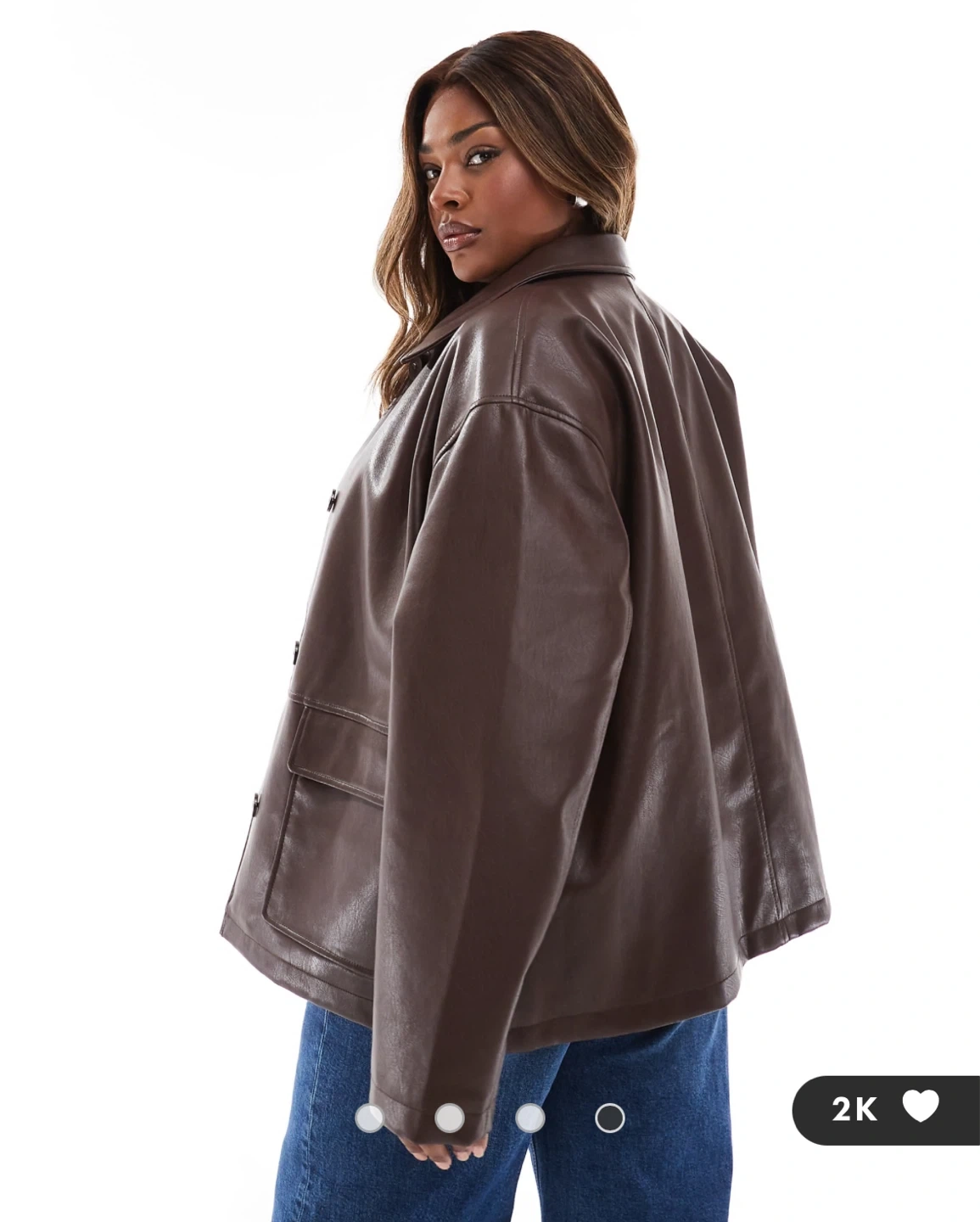 ASOS DESIGN oversized faux leather jacket in chocolate brown. It's got a pointed collar and button-through front. This jacket has flap pocket details. It's made of faux leather.