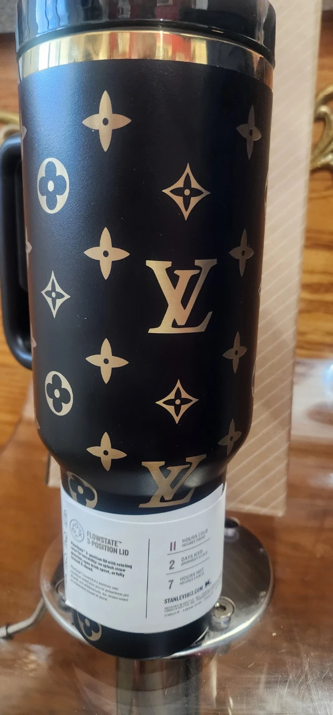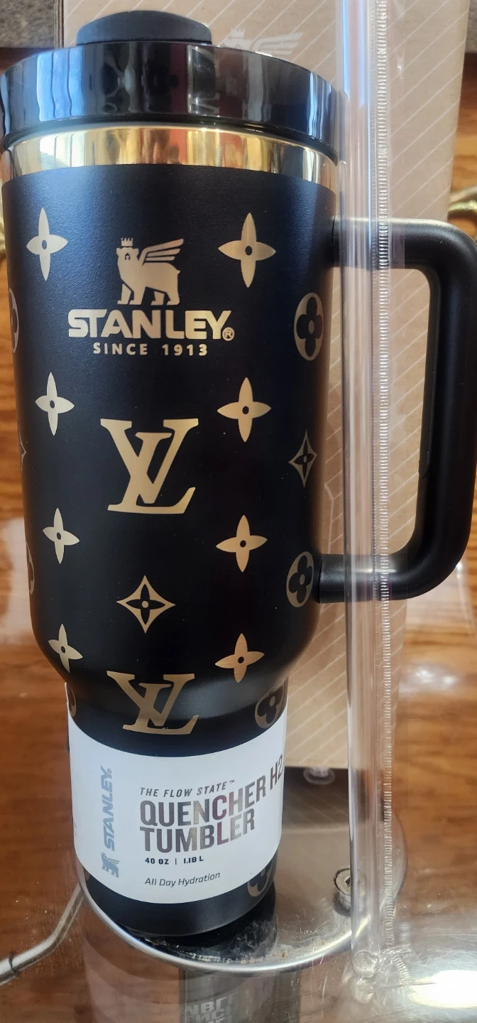 This is a Stanley FlowState Quencher H2.0 Tumbler. It holds 40 oz (1.18 L) and is designed for all-day hydration. The tumbler is black with a gold Louis Vuitton-inspired print and includes a handle and a lid with a straw.