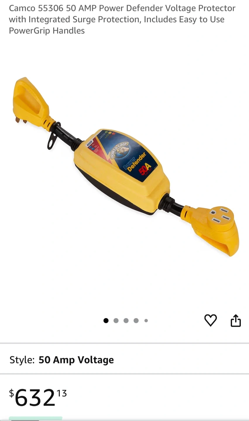 This is a Camco 55306 50 AMP Power Defender Voltage Protector with integrated surge protection — a must-have safety device for larger motorhomes and RVs.