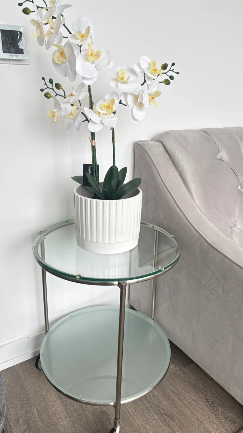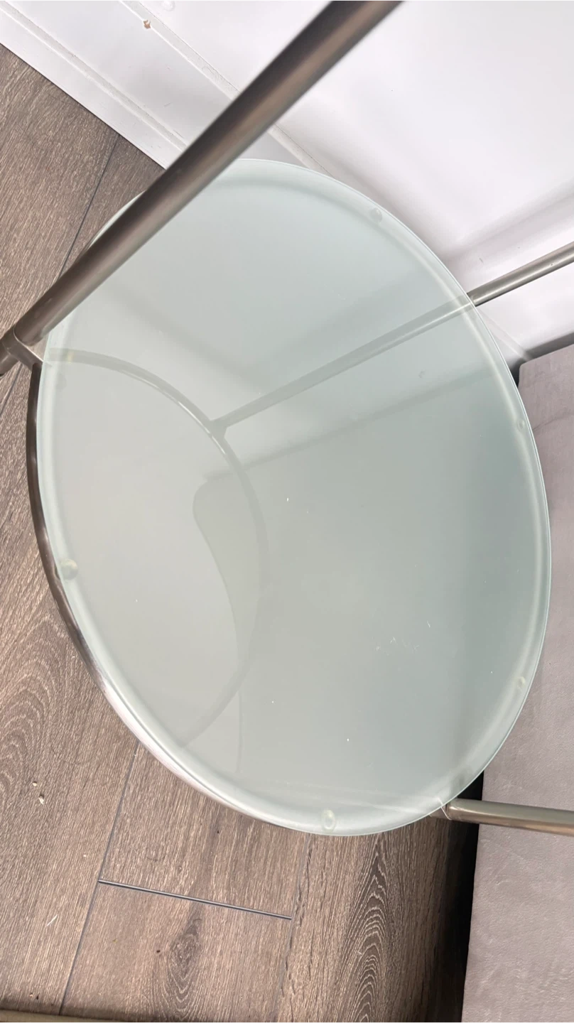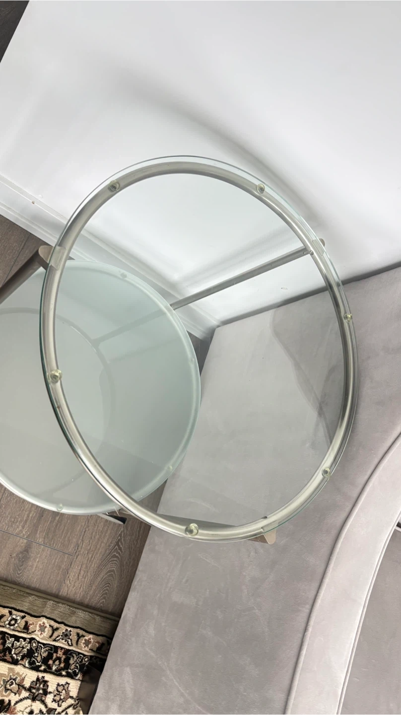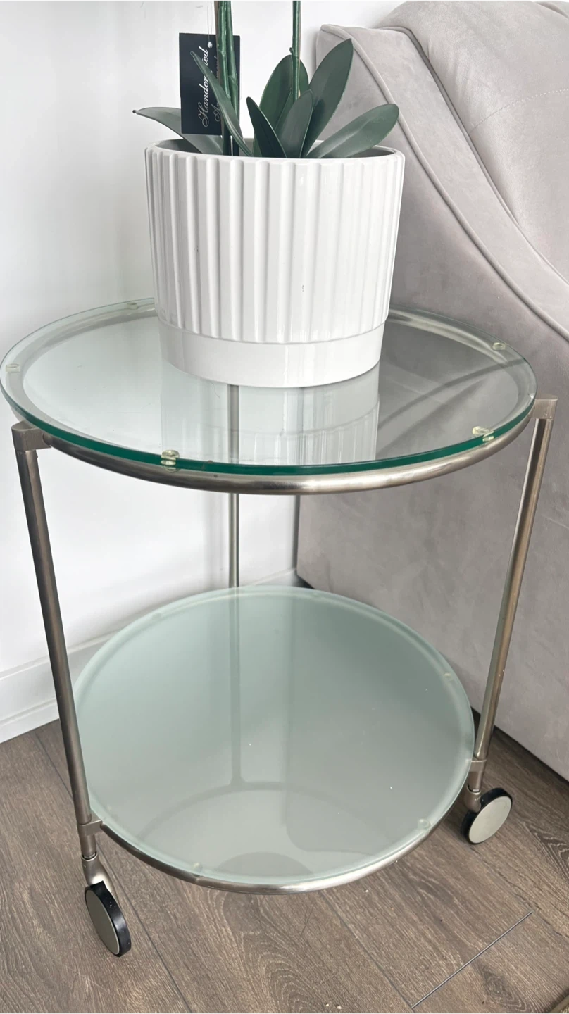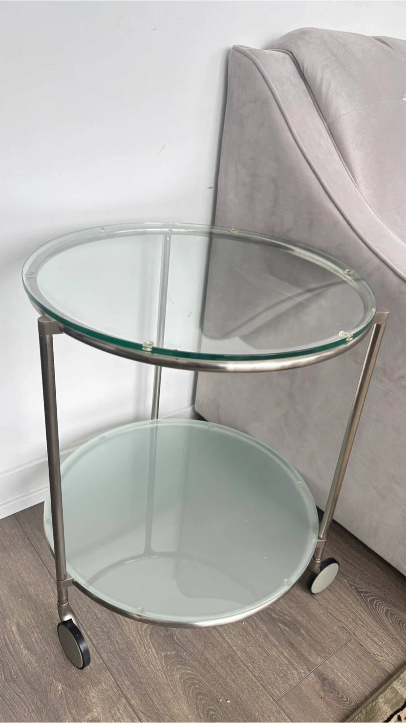This is a handy two-tier side table with a glass top and bottom shelf. It's got a metal frame and wheels for easy moving. The top shelf is clear glass, and the bottom shelf is frosted glass.