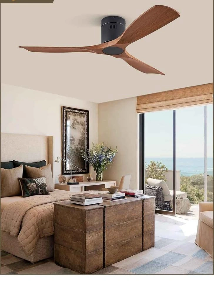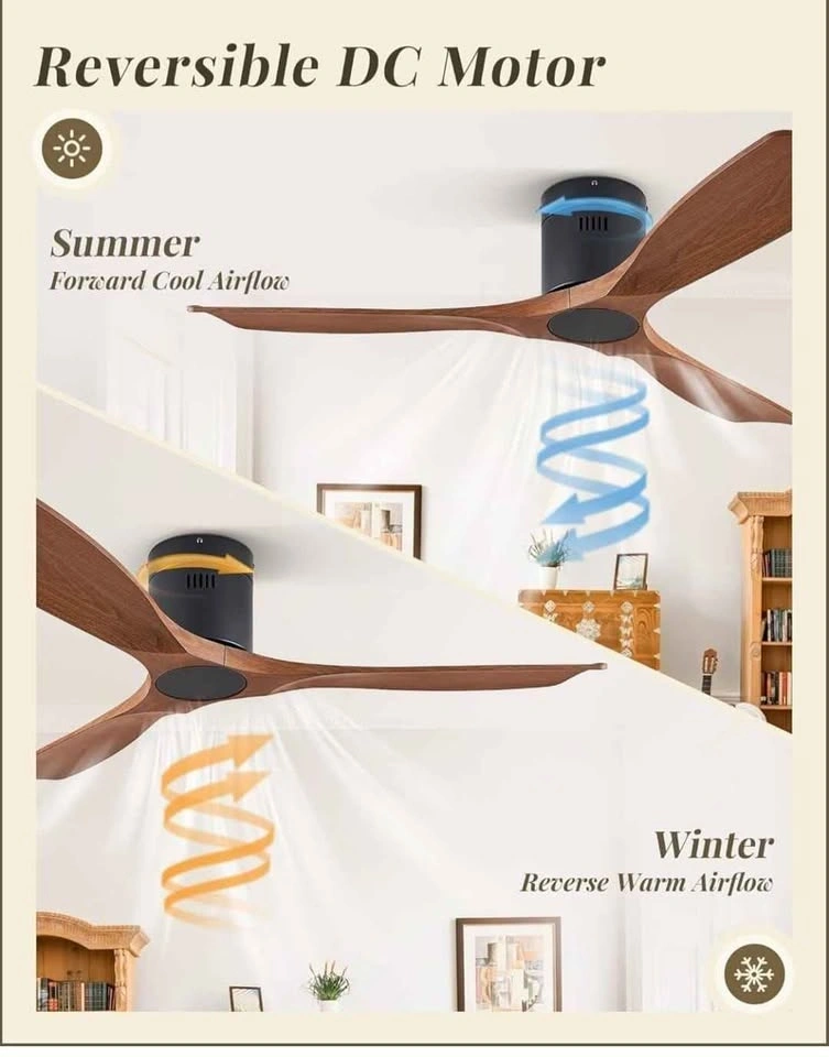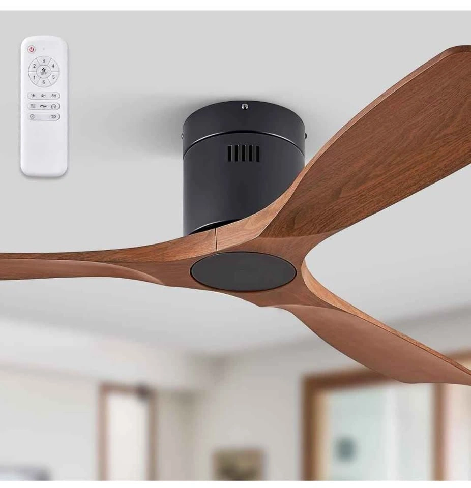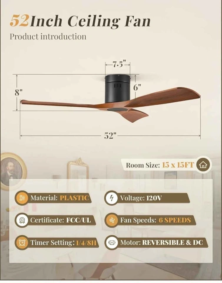 Brand new 52" ceiling fan. Flush mount, low profile design with remote control. Features 6-speed reversible DC motor. Suitable for patio, living room, or bedroom. Walnut finish.