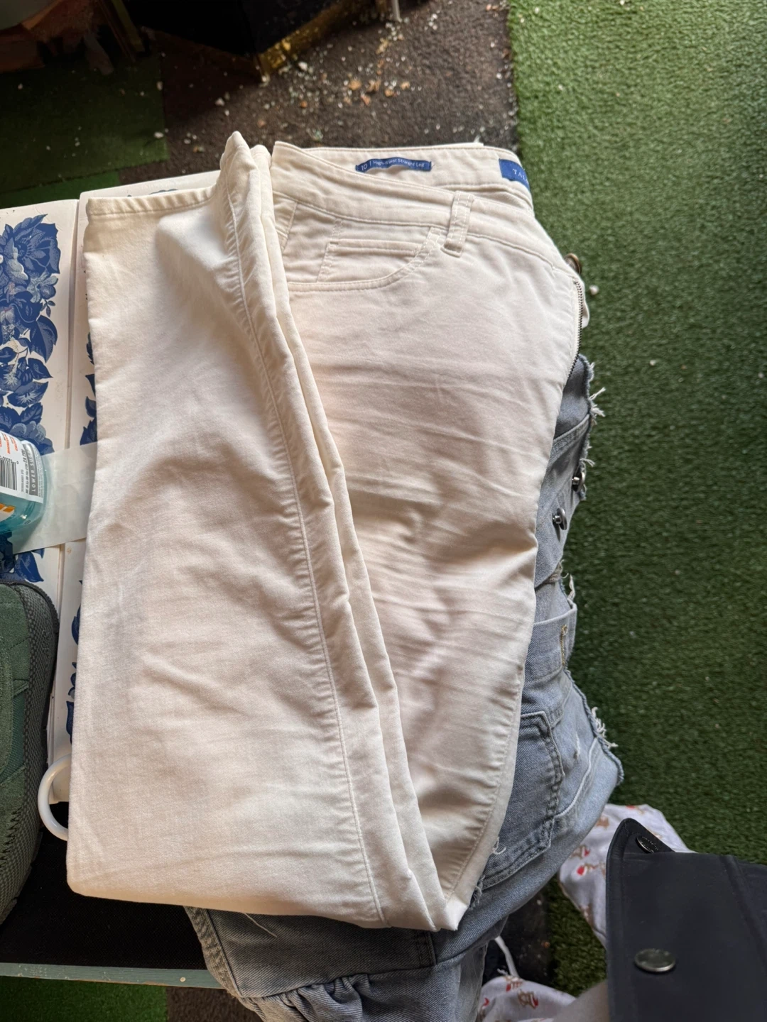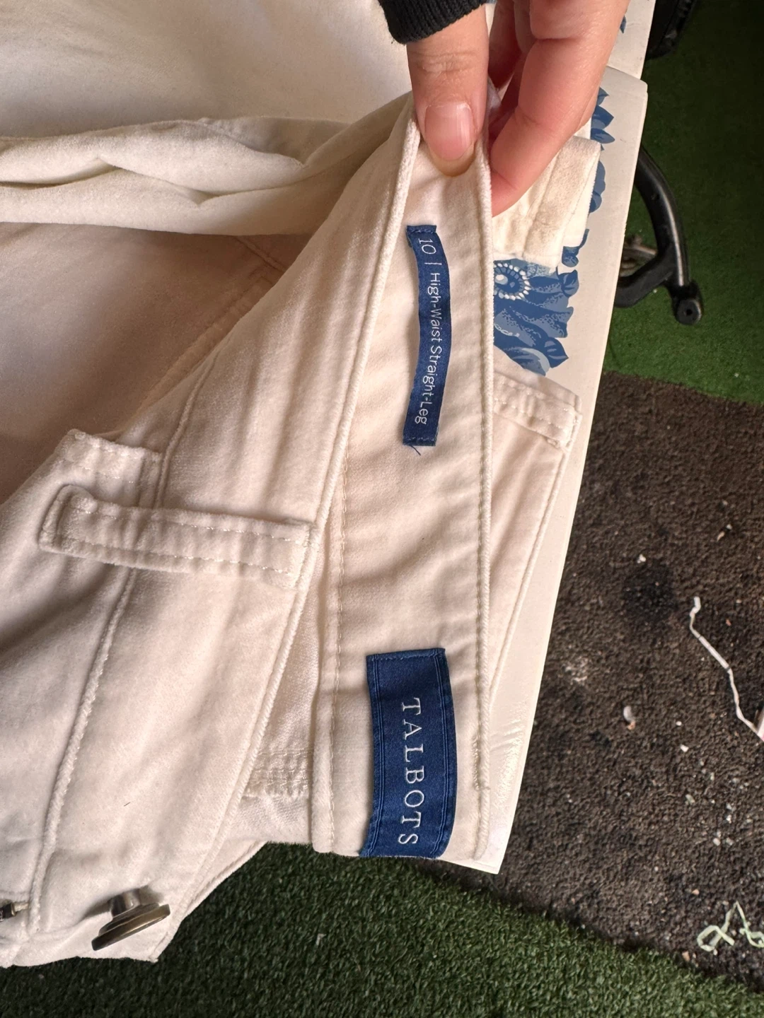 Talbots women's cream-colored pants. High-waist straight leg style. Size 10. Cotton blend fabric. These pants are a versatile addition to any wardrobe!