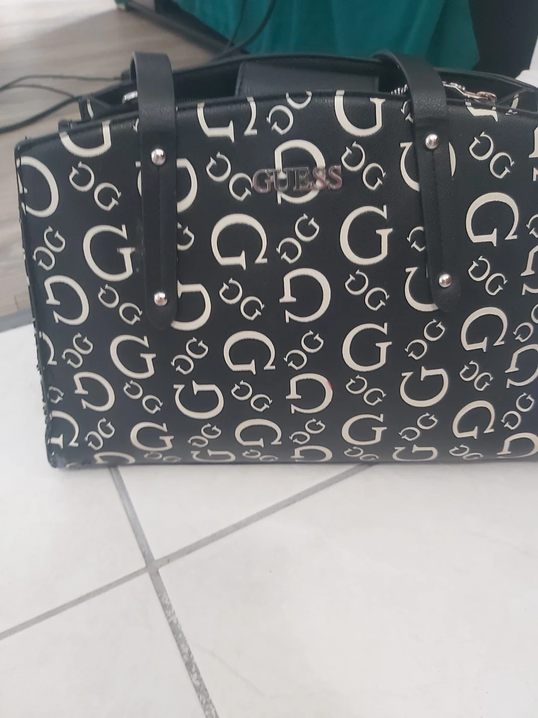 This is a Guess tote bag with a black and white monogram pattern. It's a stylish accessory for everyday use. The bag features top handles and a spacious interior.