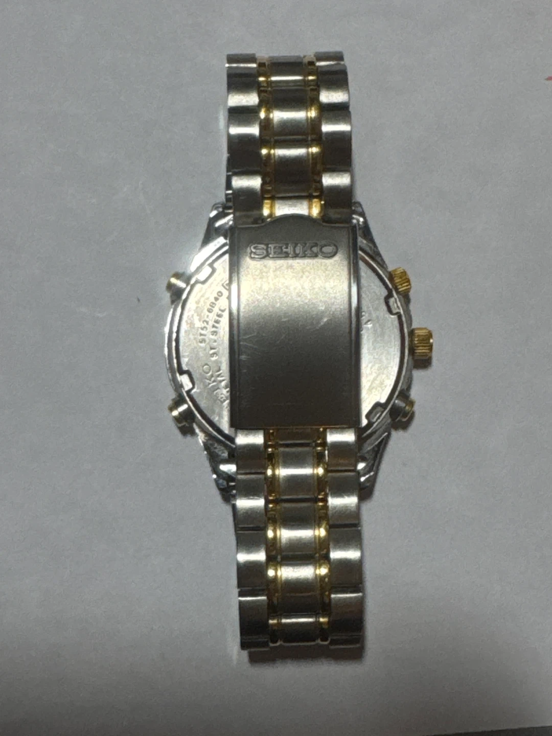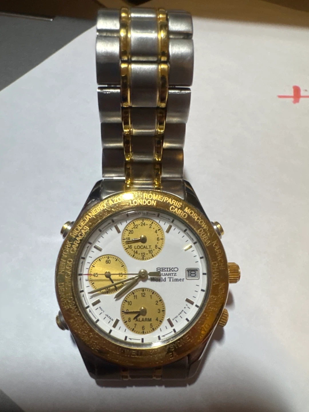 This Seiko watch features a world timer function and alarm. It has a stainless steel band with gold accents. The watch face displays multiple time zones.