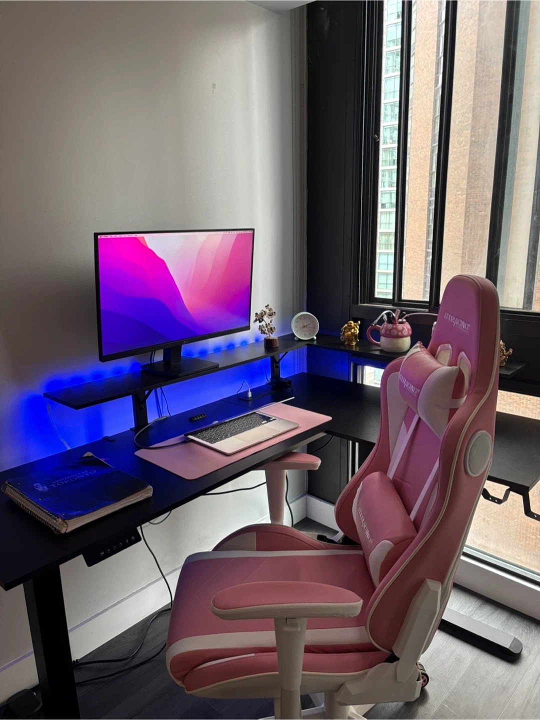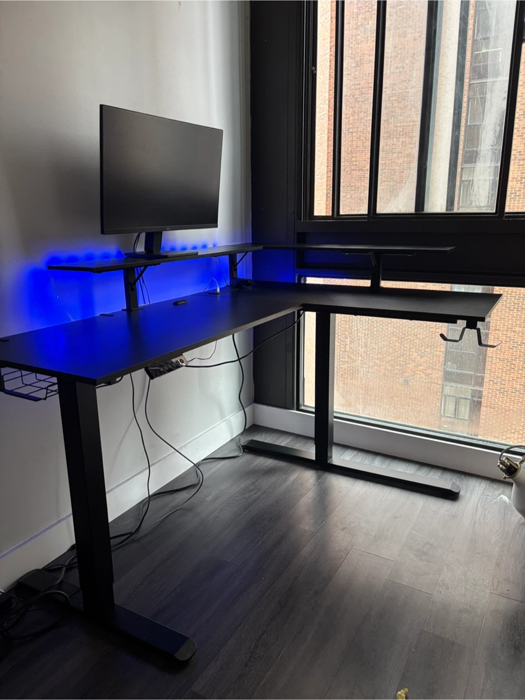 This L-shaped standing desk offers adjustable height settings for ergonomic comfort. It features a built-in monitor stand and cable management system. The black finish complements any modern workspace.