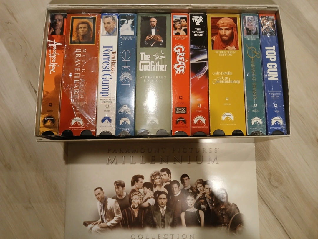 This collection includes 10 VHS tapes. The movies are: Apocalypse Now, Braveheart, Forrest Gump, Ghost, The Godfather, Grease, Star Trek: The Voyage Home, Top Gun.