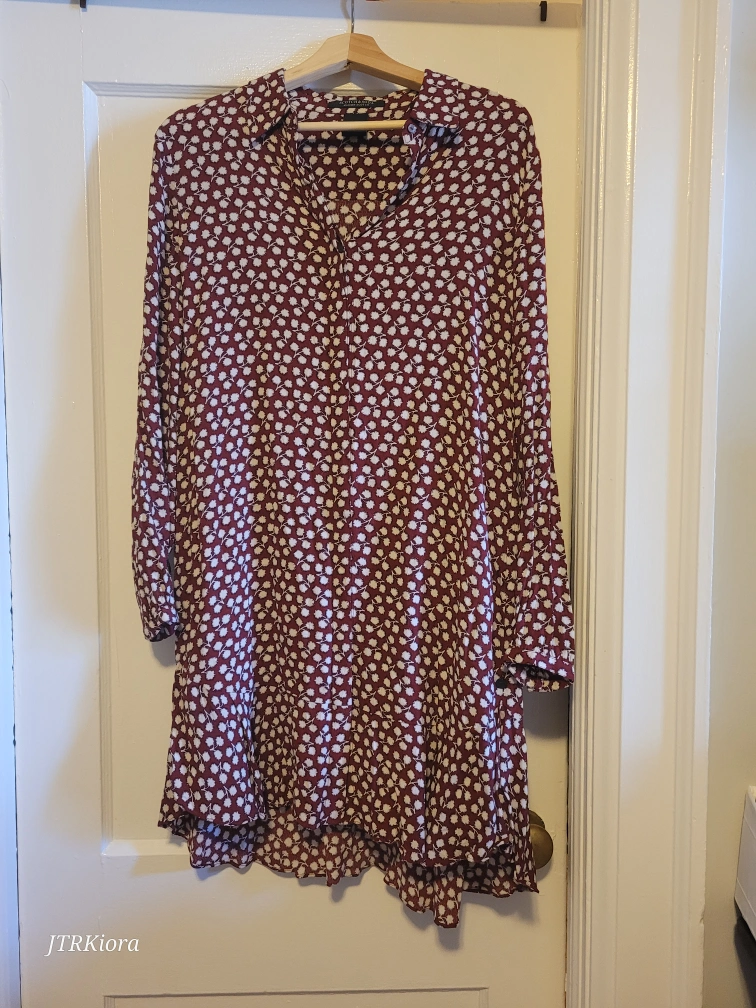 Long-sleeved collared blouse with a floral pattern. It has a button closure and a slightly longer back hem.