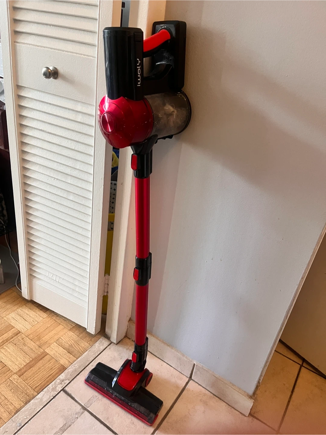 This is an iWoly cordless stick vacuum cleaner in red. It features a lightweight design for easy maneuverability. The vacuum comes with a wall mount for convenient storage. It's suitable for quick cleanups around the house.