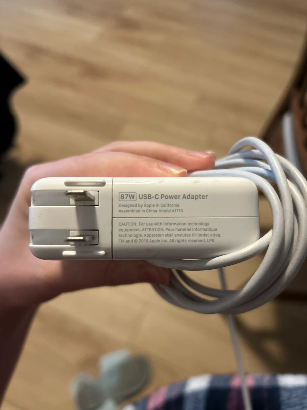 Apple 87W USB-C Power Adapter. Model A1719. It comes with a USB-C cable. This adapter is great for charging your Apple devices (phone, Macbook)