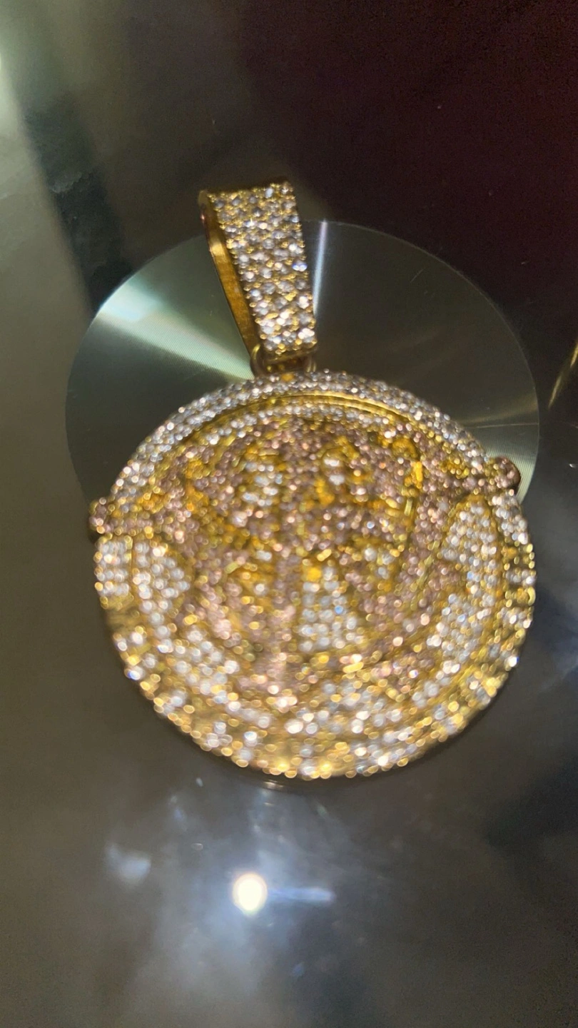 This eye-catching pendant features a detailed Medusa head design, encrusted with sparkling diamonds. It's crafted from gold and offers a bold statement piece.