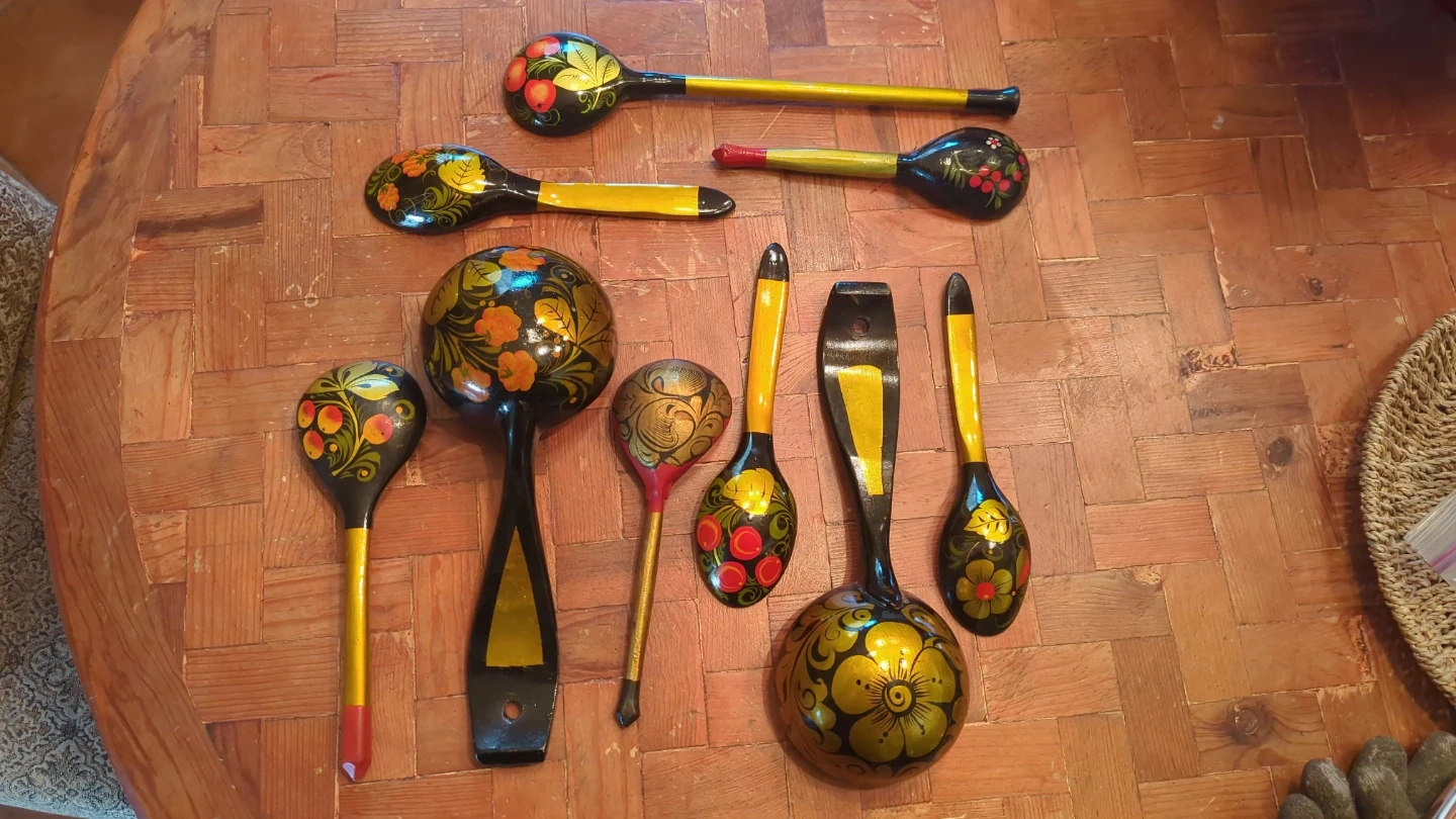 A set of nine wooden spoons featuring traditional Russian Khokhloma painting. Each spoon is hand-painted with vibrant floral and berry designs on a black background, accented with gold and red details. These decorative spoons would make a charming addition to a kitchen or as a unique gift.