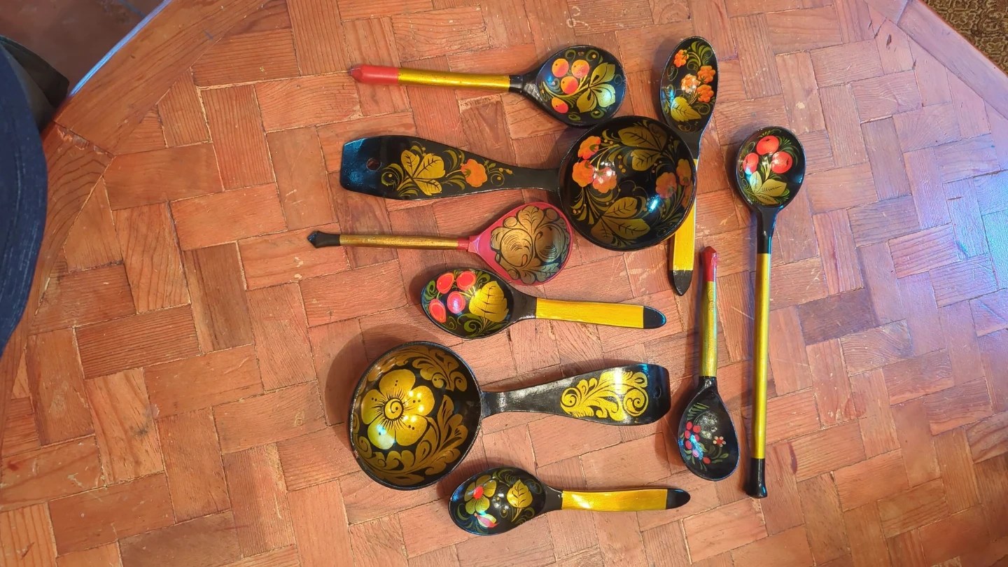 A set of nine wooden spoons featuring traditional Russian Khokhloma painting. Each spoon is hand-painted with vibrant floral and berry designs on a black background, accented with gold and red details. These decorative spoons would make a charming addition to a kitchen or as a unique gift.