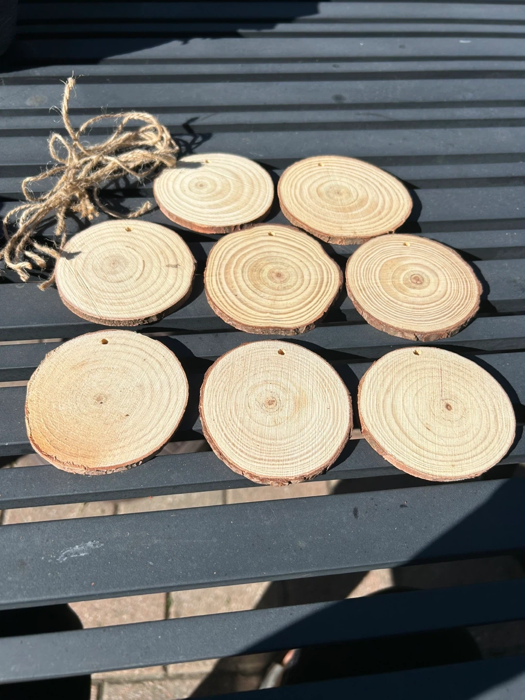Selling a set of 8 natural wooden tree slice ornaments. They're perfect for adding a rustic touch to your holiday decorations or craft projects!