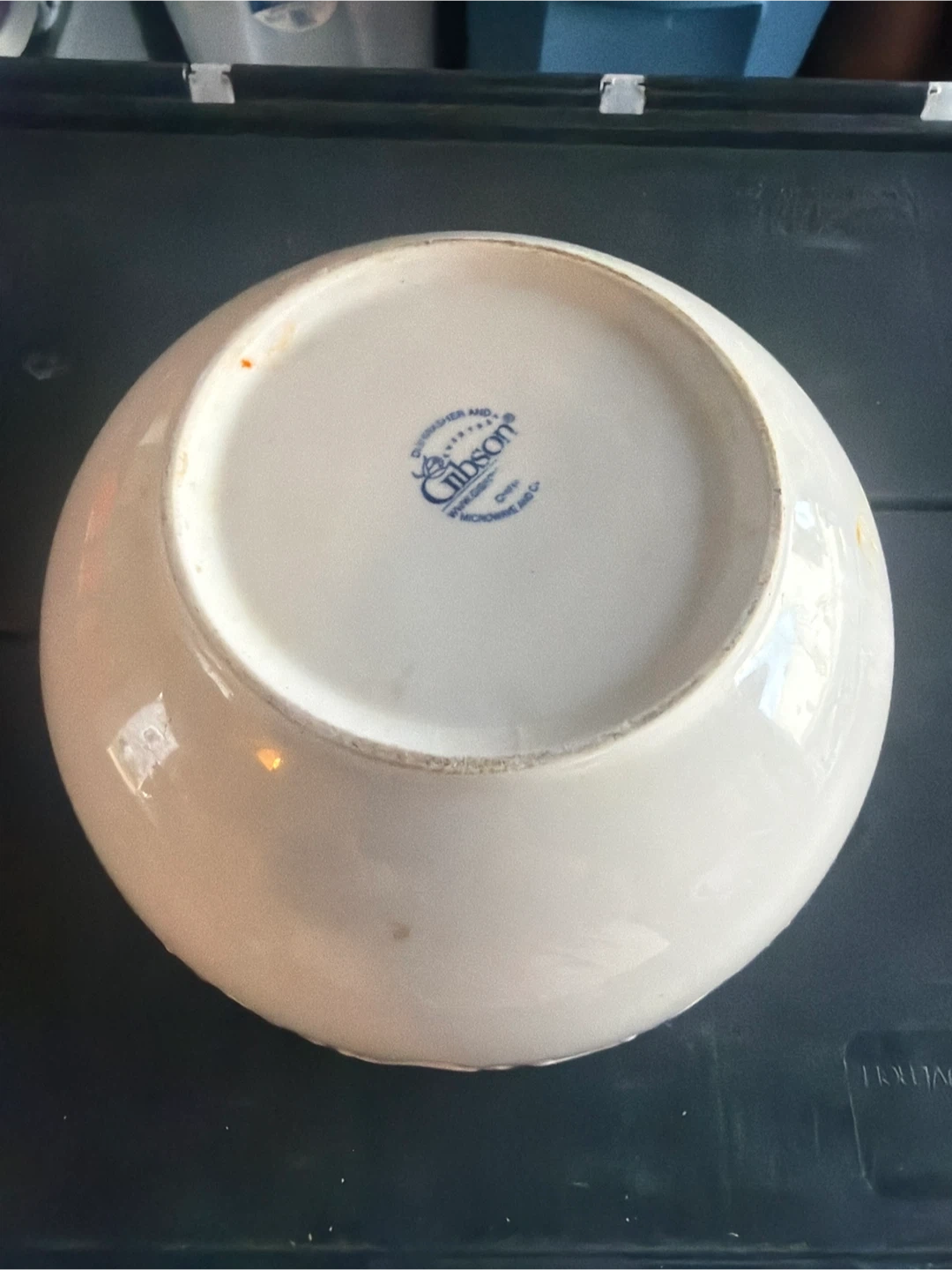 This is a white ceramic serving bowl from Gibson. It's dishwasher, microwave, and oven safe. It's a versatile bowl for serving meals.