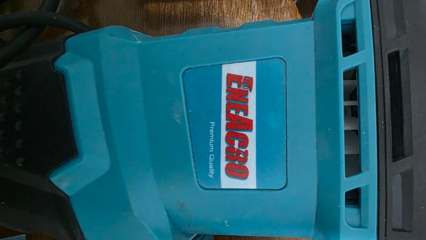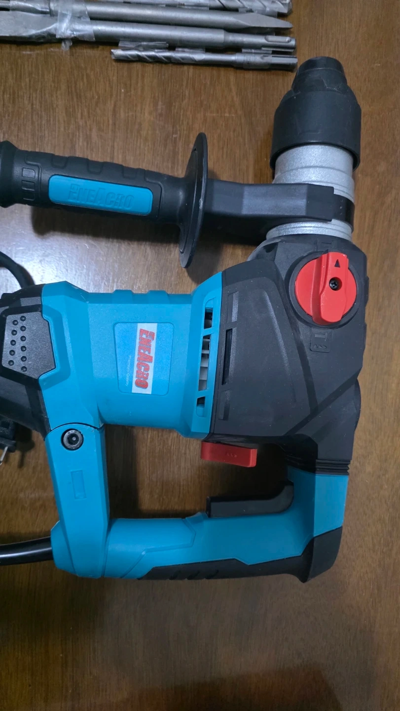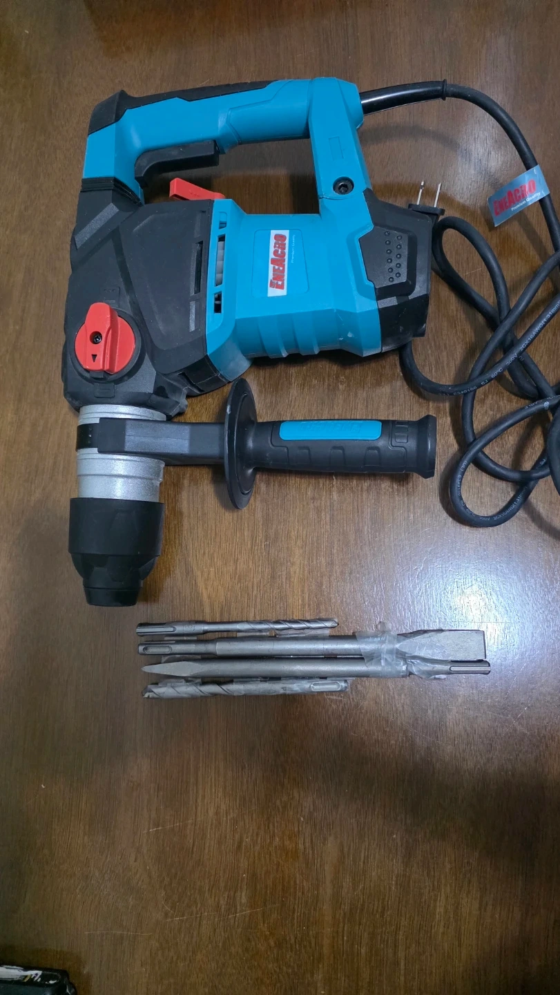 This is an ENEACRO rotary hammer drill. It includes an auxiliary handle and a set of drill bits. This tool is suitable for demolition and drilling tasks.