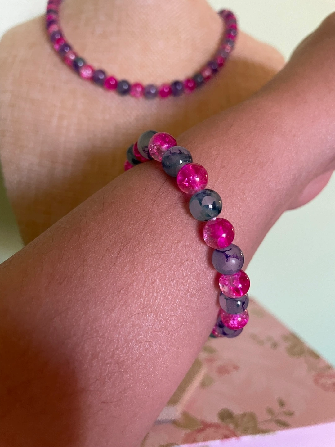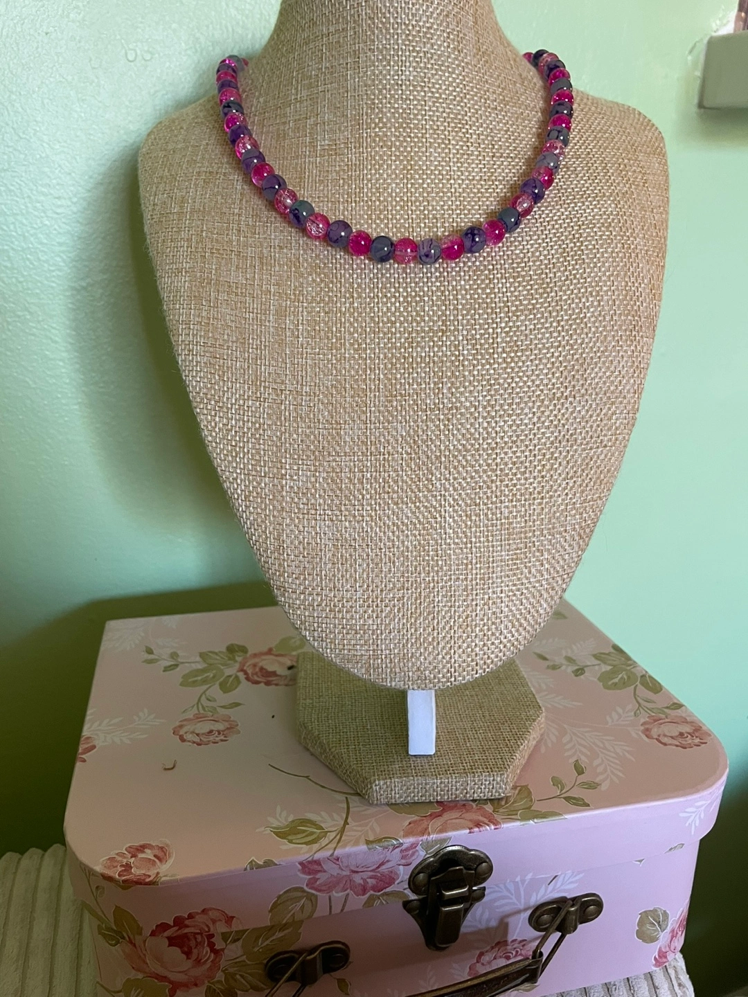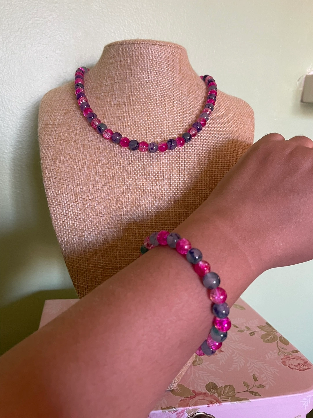 Pretty necklace and bracelet set. Features pink and blue glass beads. Rose-shaped clasp. Great for layering or wearing alone.