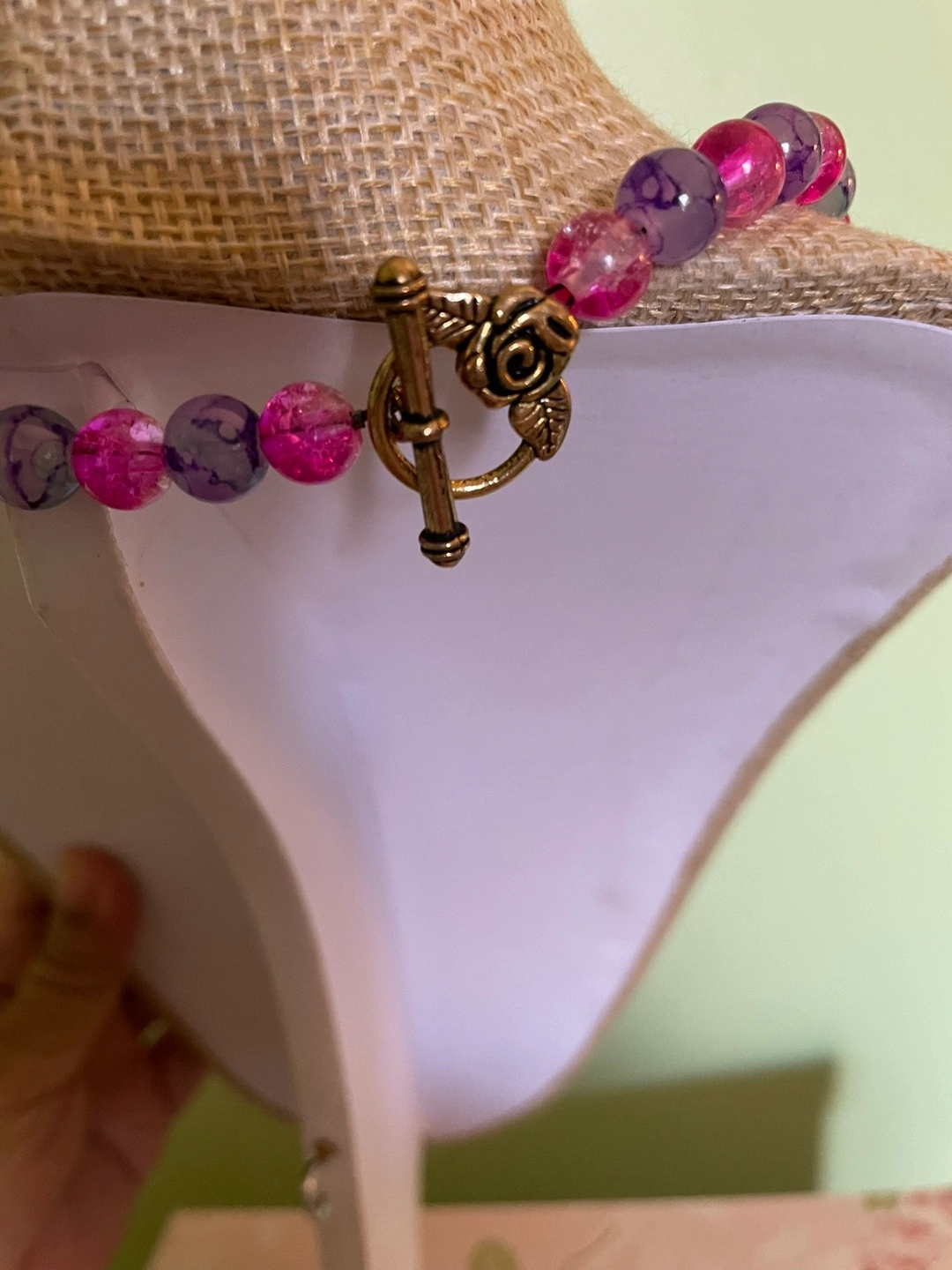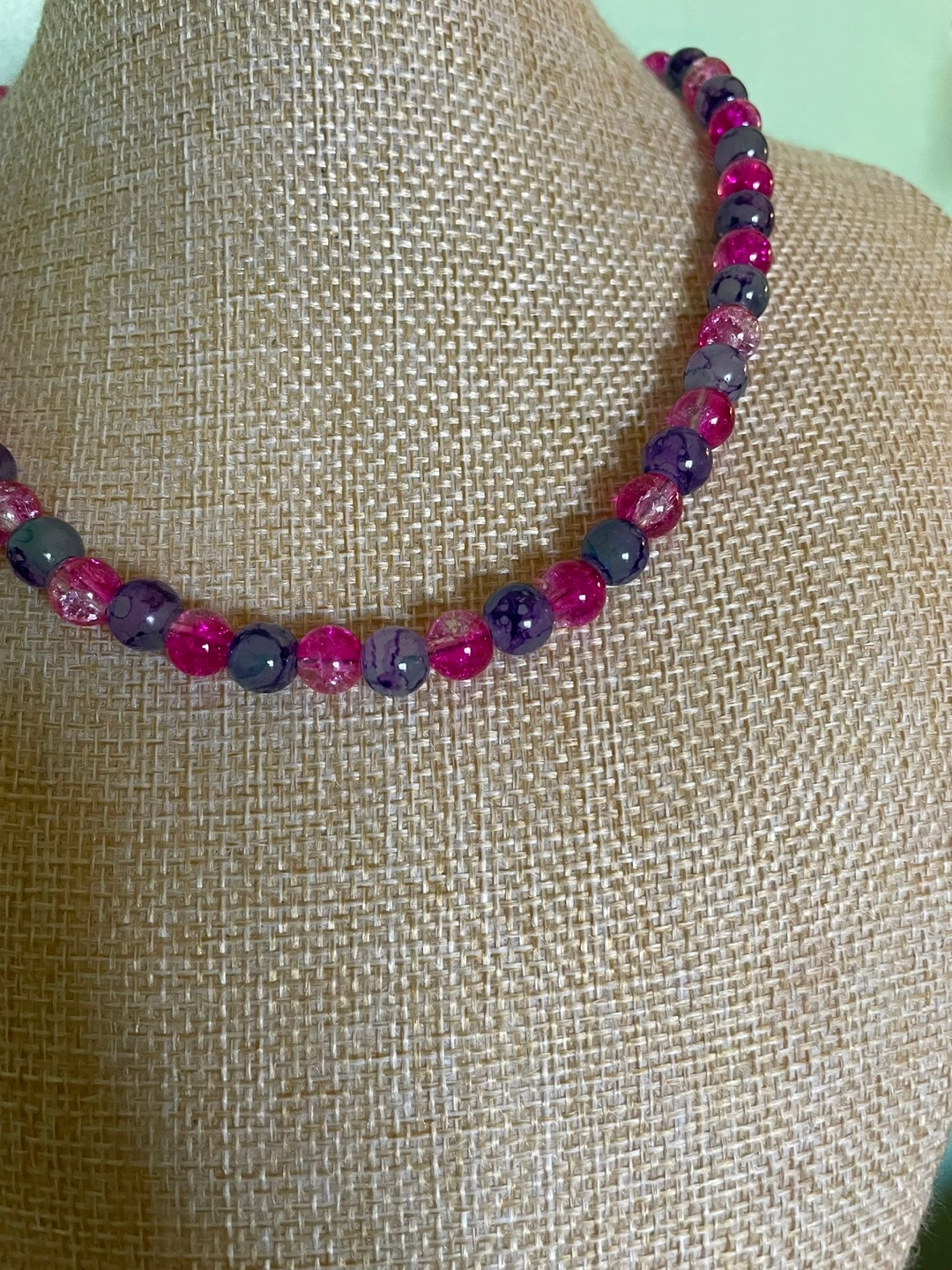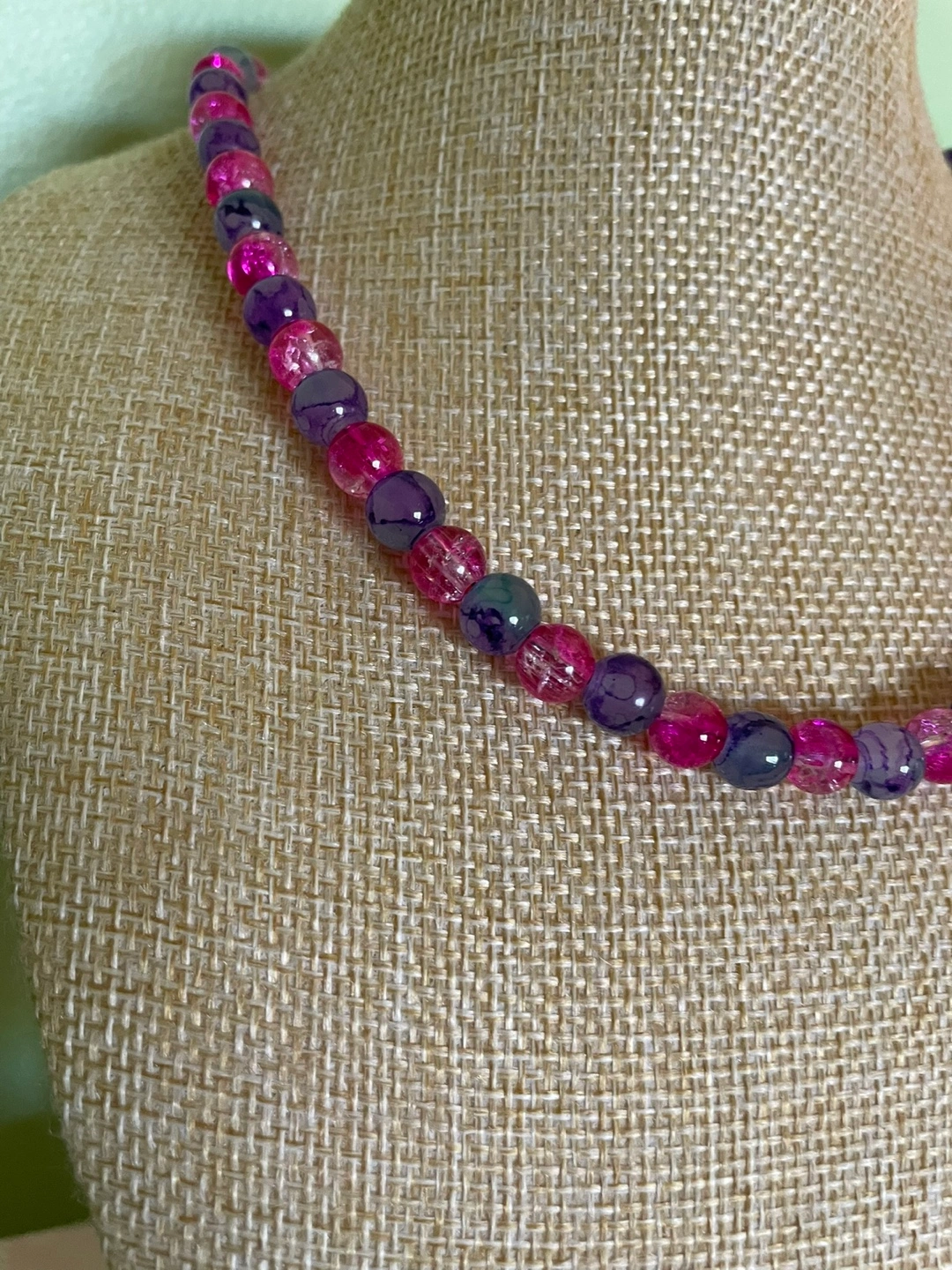 Pretty necklace and bracelet set. Features pink and blue glass beads. Rose-shaped clasp. Great for layering or wearing alone.