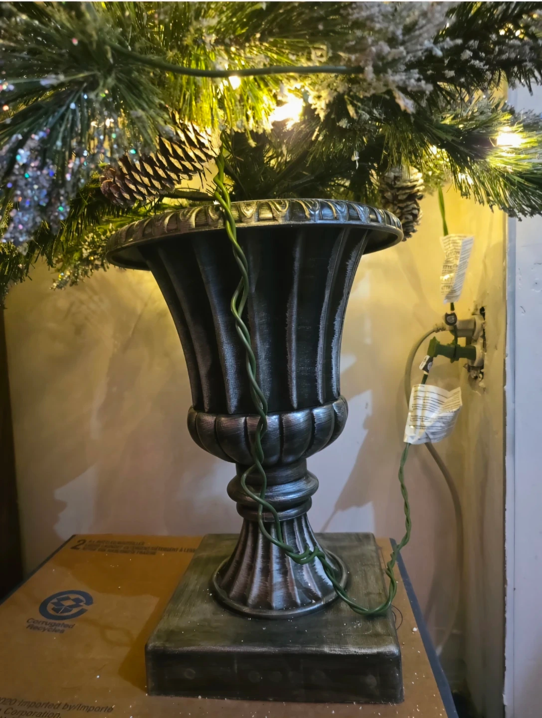 A festive pre-lit artificial Christmas tree, adorned with pinecones and lights. It's housed in a decorative dark grey urn planter, perfect for adding holiday cheer. This tree adds a lovely touch to any indoor space during the Christmas season!