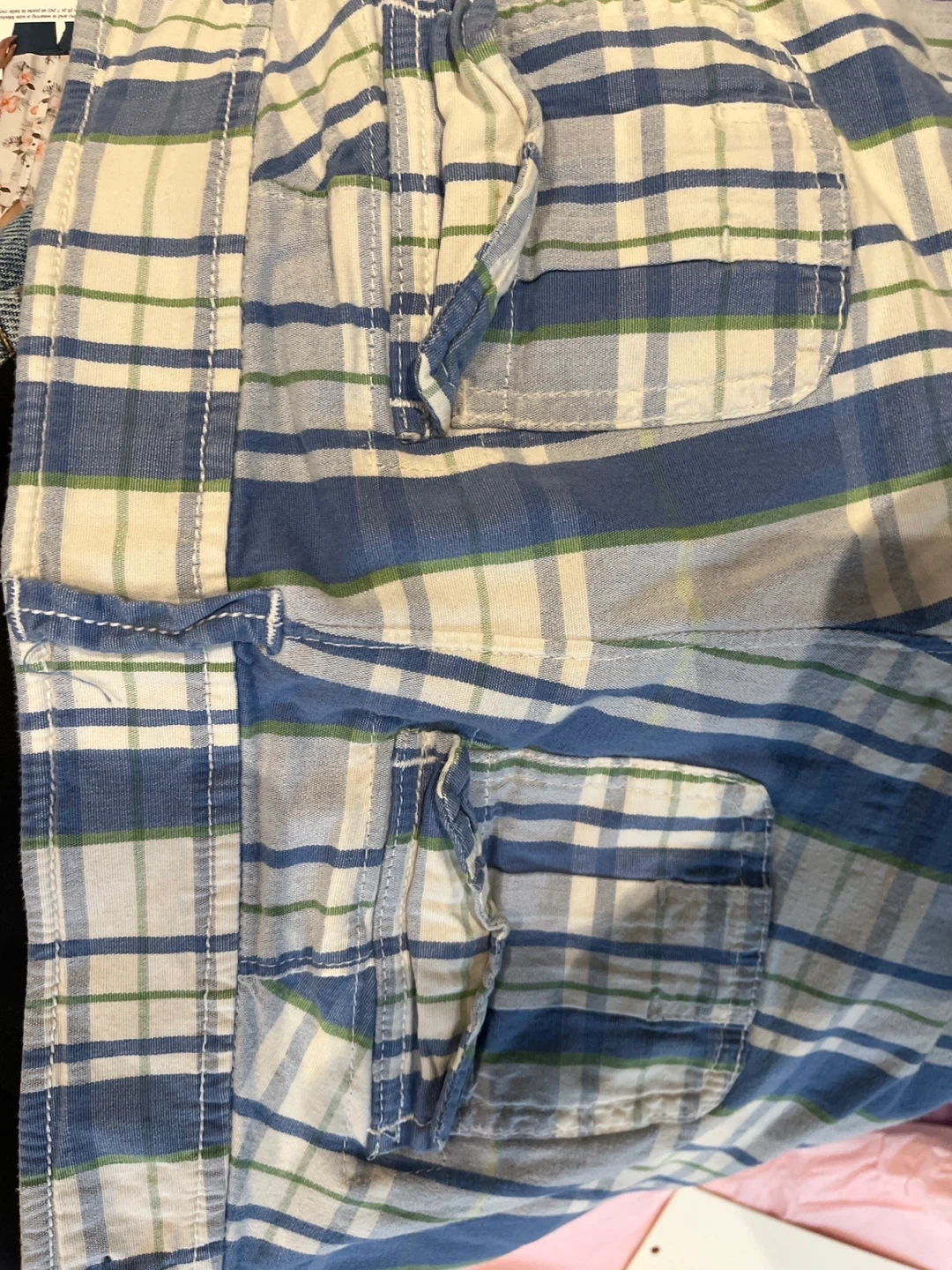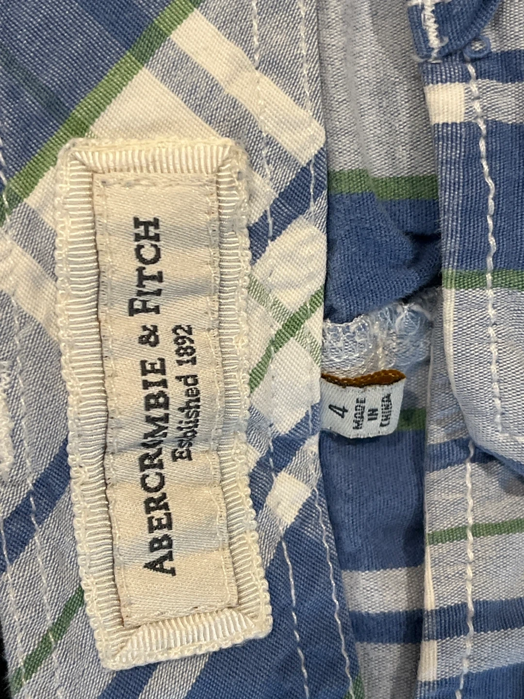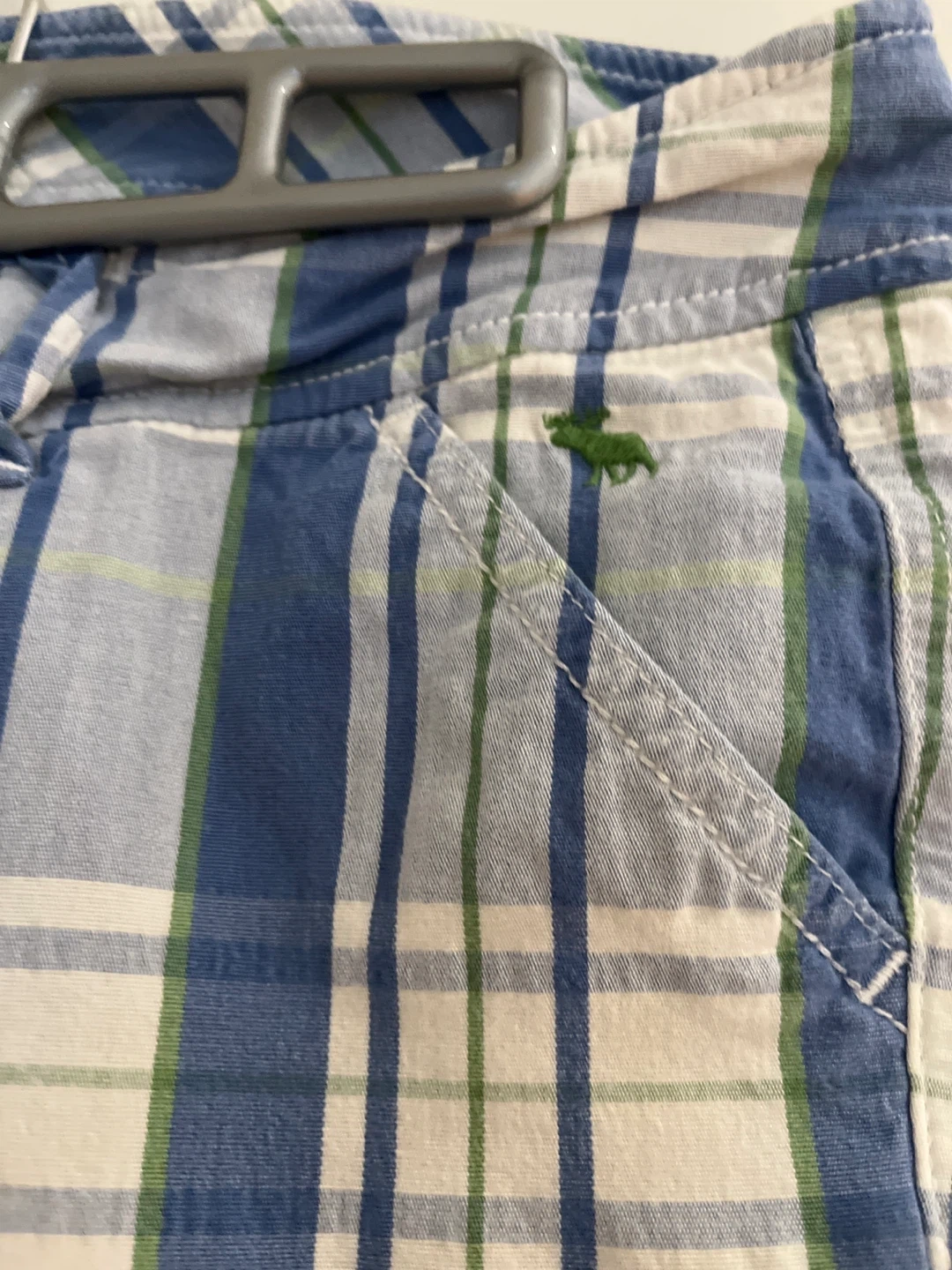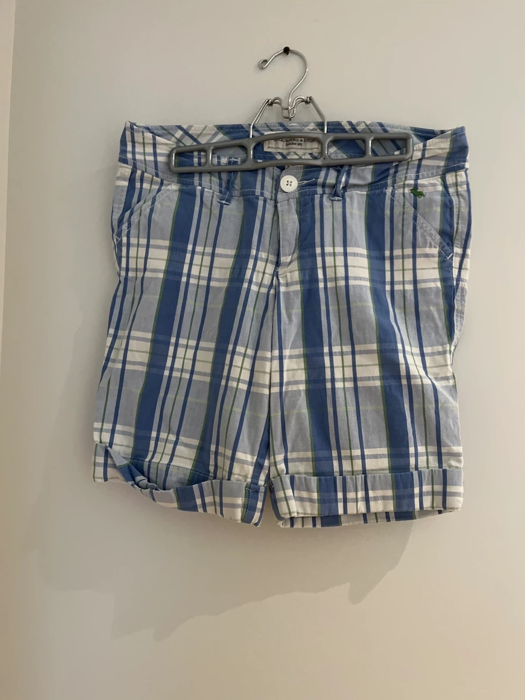 These are Abercrombie & Fitch plaid shorts in a size 4. They're made of a comfortable cotton blend. Features include a button and zip fly, belt loops, and front and back pockets. Low Waisted